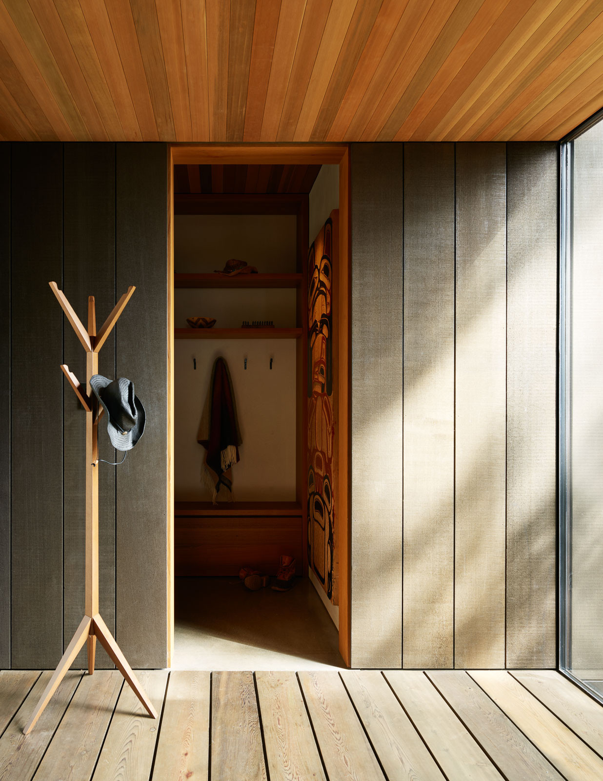 The same cedar decking from the boardwalk flows inside the house, creating an easy transition between the interior and exterior spaces. It also brings the feeling of being outside into the house, enhanced by the dappled shade from surrounding trees that dances on the walls and floors.