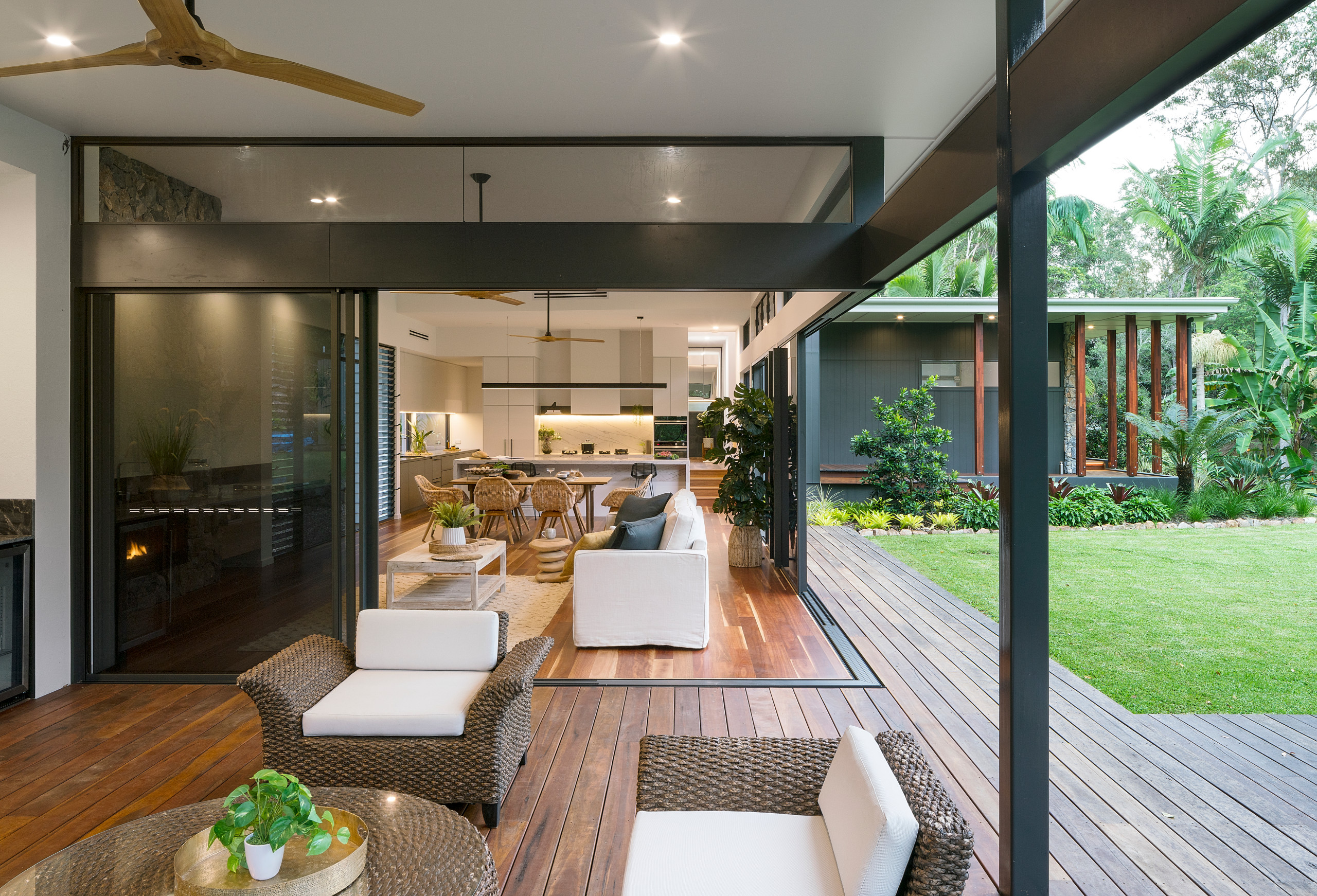 In most parts of Australia, indoor-outdoor living is cherished almost year-round. Built by SX Constructions, this Sunshine Coast home in Queensland opens up the dining and living areas completely to the landscape, with sliding walls creating a wide-open connection between spaces. Additionally, wood flooring inside the house and exterior wood decking help to meld the two living spaces together.