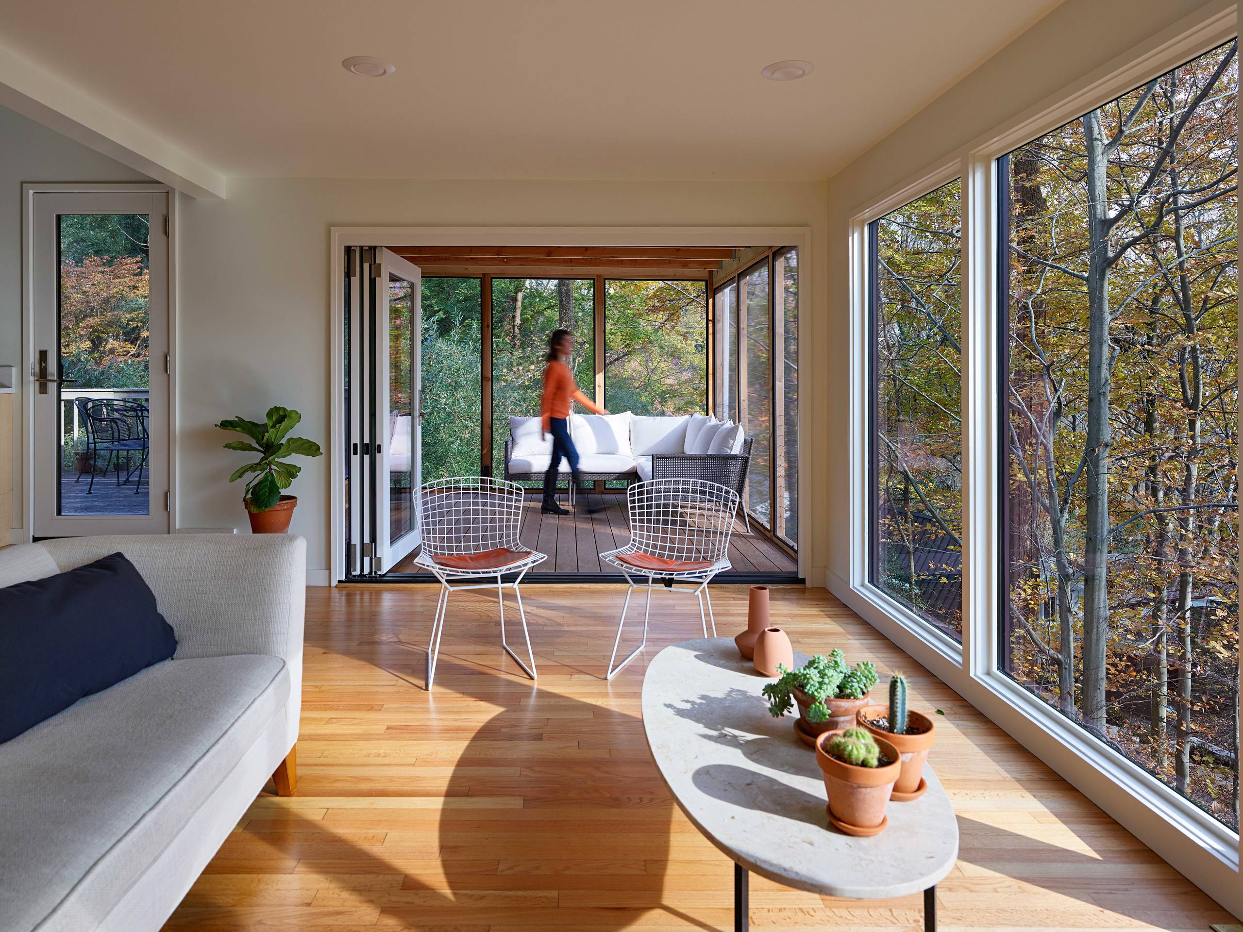 Indoor-outdoor living seems natural in places with mild climates, like California and the Mediterranean, but what about regions that experience more extreme weather or have a lot of bugs and wildlife? In this home in Baltimore, USA, a wall of windows provides year-round connection to the outdoors, with views of the surrounding woodland changing throughout the year.
