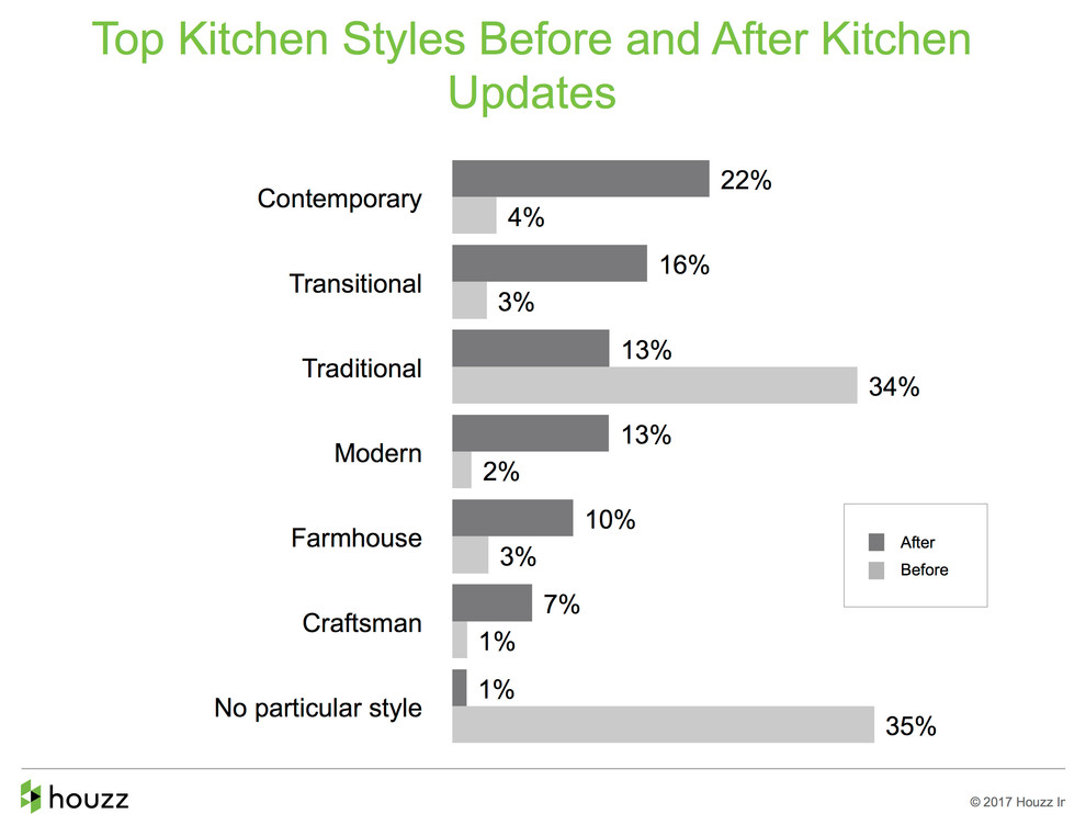 Contemporary moment. In terms of style post-renovation, contemporary has surpassed transitional in popularity among kitchen renovators, the survey found. Style preferences have an interesting correlation with age group: Millennial homeowners (ages 25 to 34) are more likely to choose modern and farmhouse style, while baby boomers (ages 55 and up) are more likely to prefer traditional style. Millennial homeowners are also more likely to install kitchen islands.