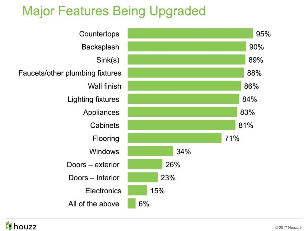 Countertops before electronics. Countertops are the most popular feature to upgrade, followed closely by backsplashes and kitchen sinks. Notably, a majority of kitchen renovations (51 percent) open the space more to a nearby room, reflecting the ongoing popularity of the great-room concept.