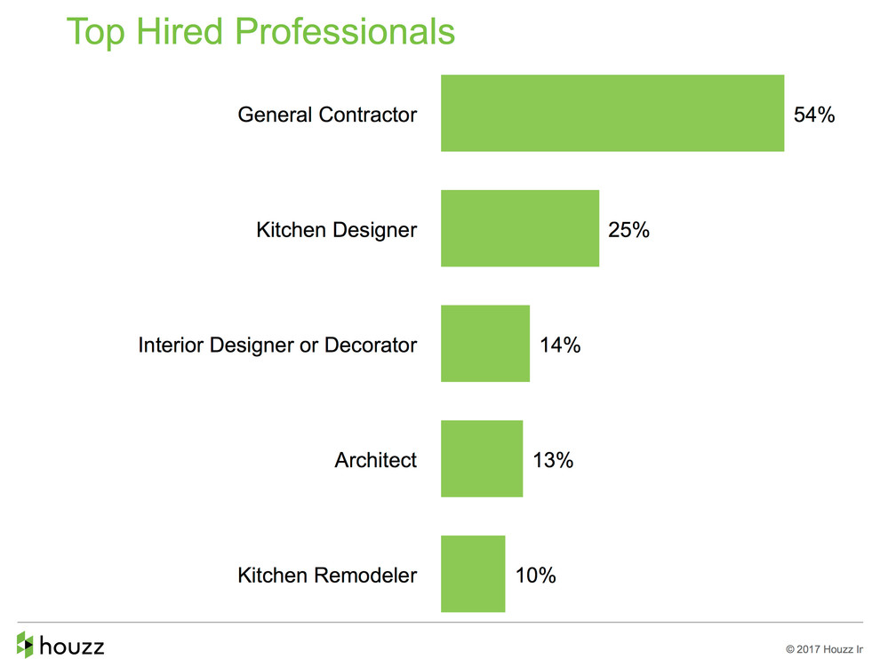 If you can’t hang drywall yourself, you’re in darn good company. While some Houzz readers are intrepid DIYers, the majority — 88 percent — hire at least one pro for their kitchen renovations, according to the survey. General contractors are the most frequently hired professionals, chosen by 54 percent of renovating homeowners.