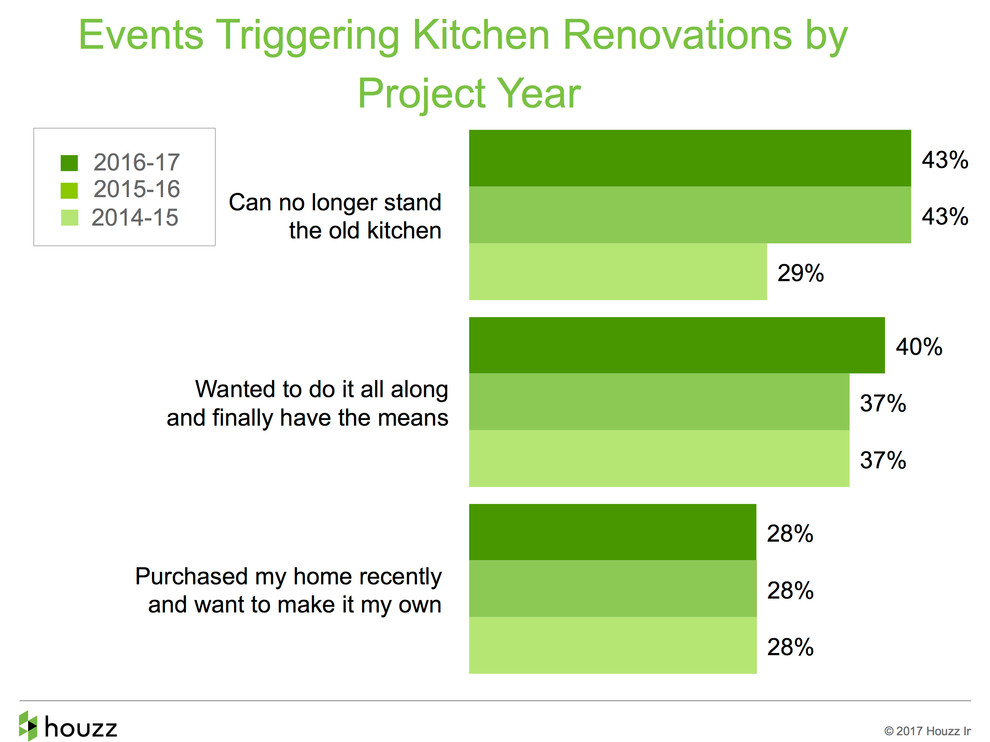 If I see that backsplash one more time … The top motivator for renovating a kitchen continues to be that owners can no longer stand the old kitchen. An increasingly popular reason is finally having the financial means, the triggering factor for 40 percent of renovators, compared with 37 percent the year before.