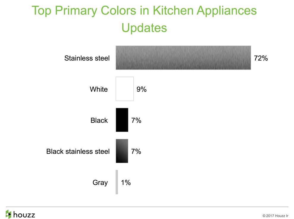 Stainless steel is not just for forks. Stainless appliances are the most popular appliance color choice for updated kitchens, with 72 percent of renovating homeowners selecting this finish. White came in a very distant second.