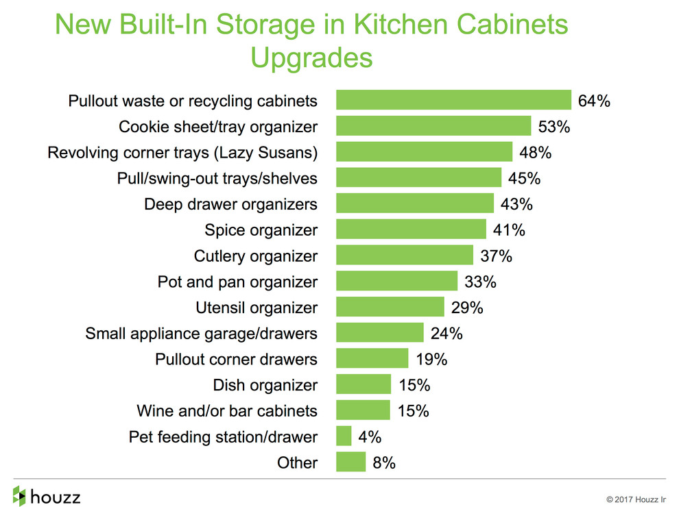Organization nerds, meet your dream kitchen. Among the renovating homeowners who are upgrading their cabinets, a large share choose built-in organizers that help them maximize their space. The most popular built-in is a pullout trash or recycling cabinet, followed by cookie sheet organizers and then Lazy Susans.