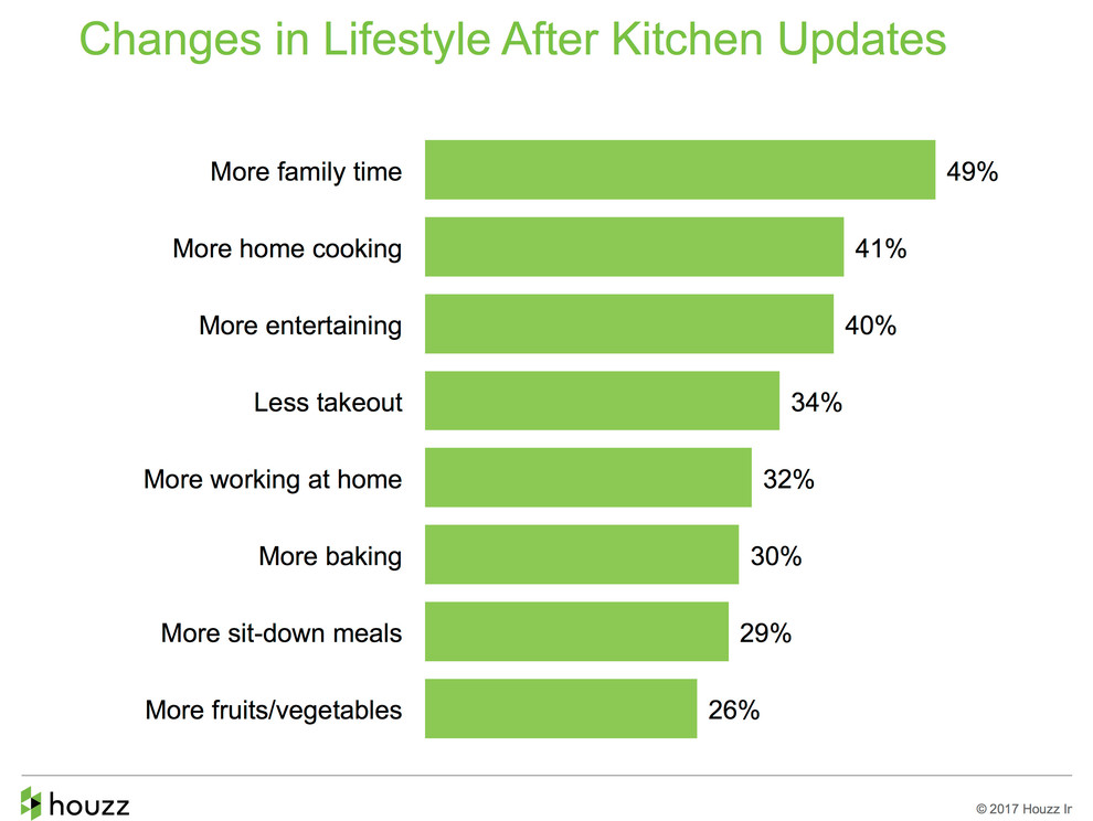 Renovate to lose weight? One-third of kitchen renovators claimed healthier habits post-renovation, while the remaining two-thirds of kitchen renovators said they were equally healthy after the renovation. Forty-one percent of homeowners who renovated their kitchens are cooking more at home, 34 percent are ordering less takeout, and 26 percent are eating more fruits and vegetables. A whopping 76 percent of kitchen renovators cook five or more meals at home each week after their renovation.