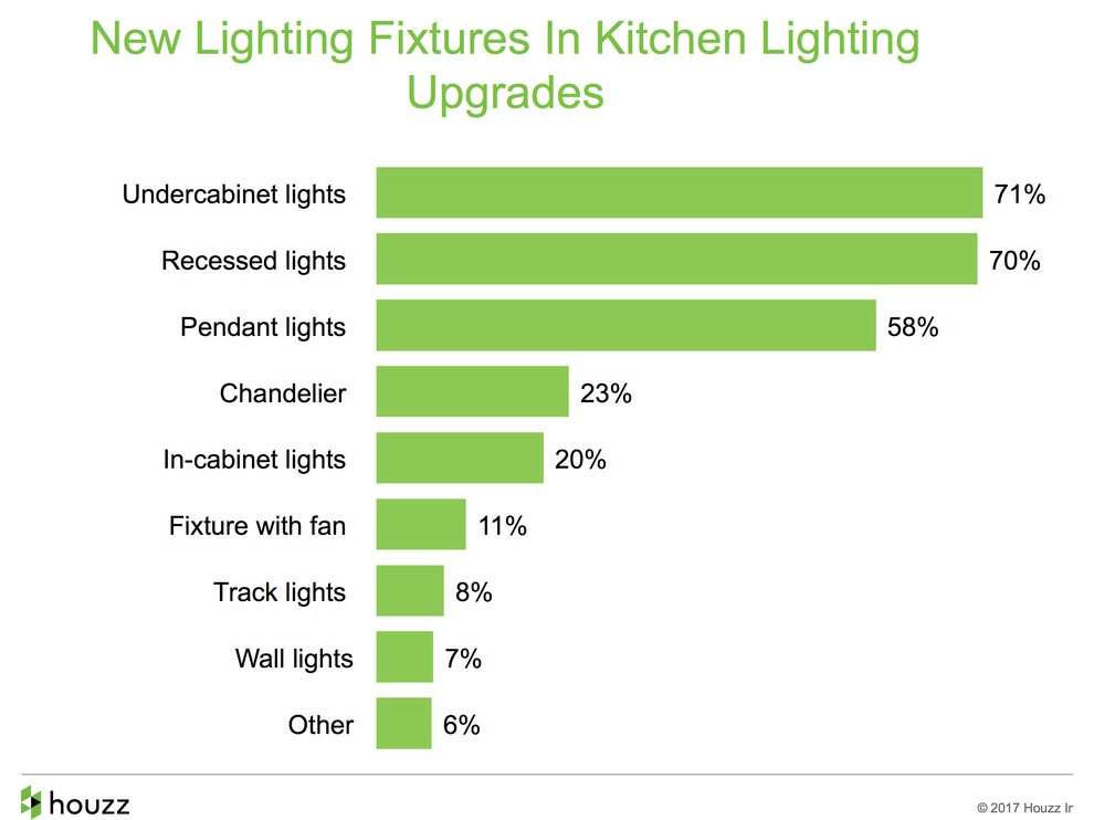 Setting the mood. Undercabinet lighting remains the most popular choice for new lighting features, but the popularity of pendant lights is on the rise.