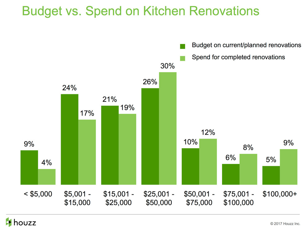 How much does it cost? The most common budget — as well as actual spend — on a kitchen renovation remains $25,001 to $50,000, according to the survey. Only 9 percent of kitchen renovators spend more than $100,000; just 4 percent spend less than $5,000. We hope the numbers help give your own project some dollars-and-cents context.