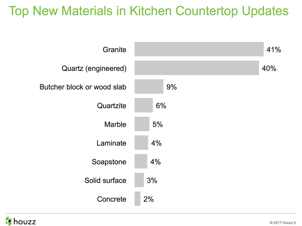 The 2017 U.S. Houzz Kitchen Trends Study, from a research team led by Nino Sitchinava, Houzz’s principal economist, reveals that homeowners updating their kitchens prioritize changing out countertops, backsplashes and sinks. A majority of kitchen renovators are also choosing a more open feel for this room.