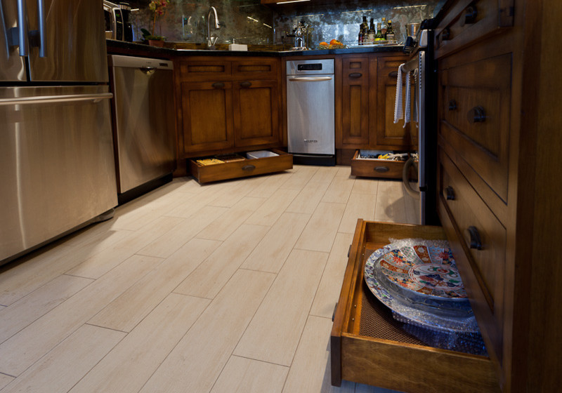 Think you’re out of storage space in your kitchen? Think again. Toe kicks, the baseboards of your cabinets, conceal unused space big enough to hold slim drawers. Of course, the narrow space doesn’t fit everything, but I have four toe kick drawers in my own kitchen that hold less frequently used kitchen tools, such as a cherry pitter and a candy thermometer; emergency supplies, such as candles, batteries and flashlights; appliance manuals; service receipts; and pet bowls. Think of all that storage you may be missing out on!