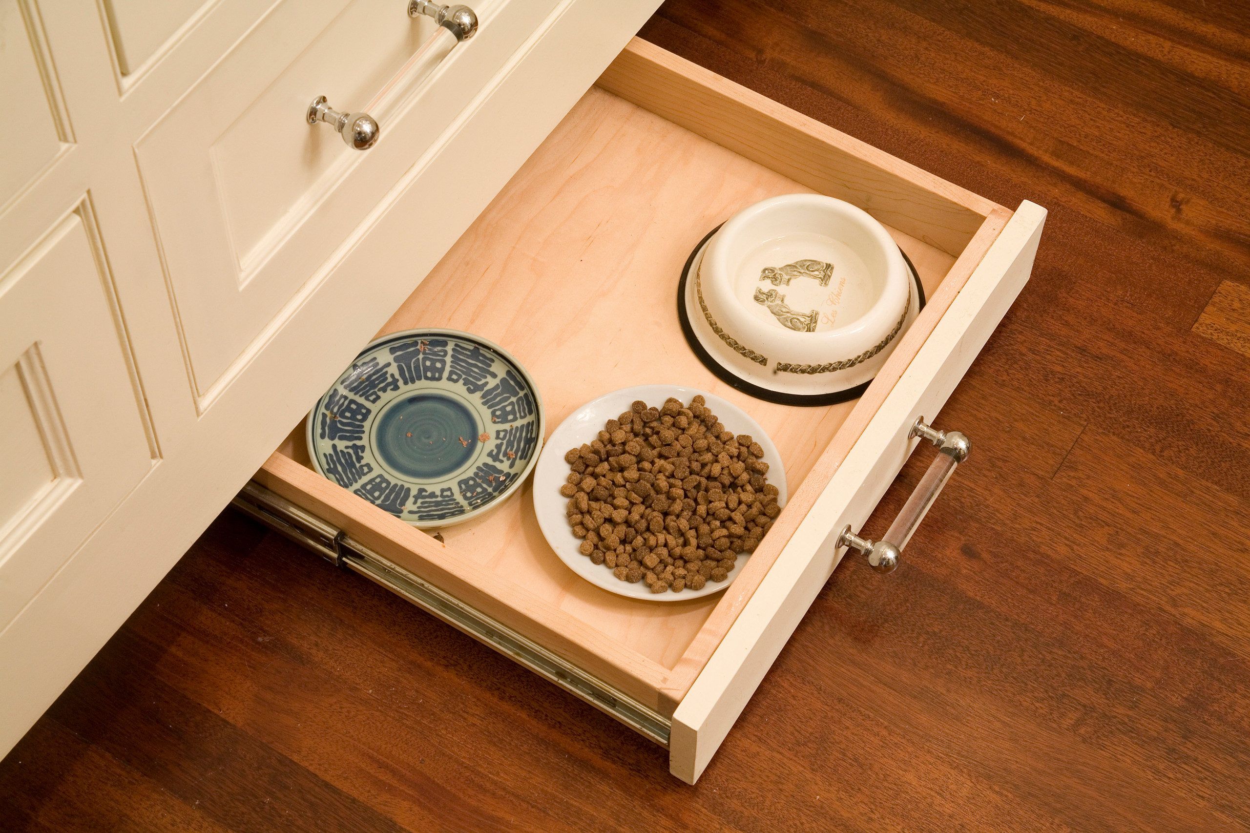 I love this idea for storing pet bowls. When your animals are done eating, just push the drawer back in. Just make sure that the location of your pet drawer won’t block a main aisle, especially during busy times.