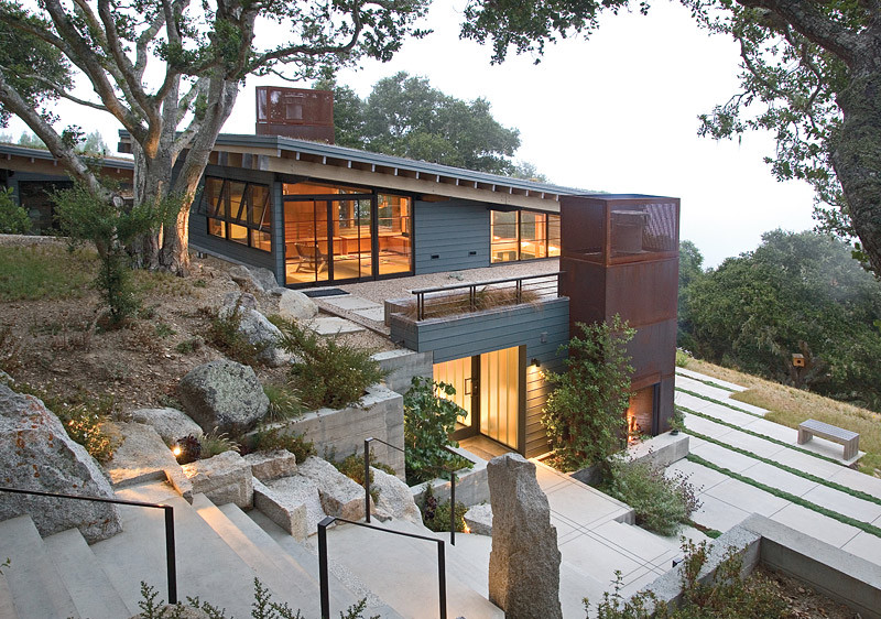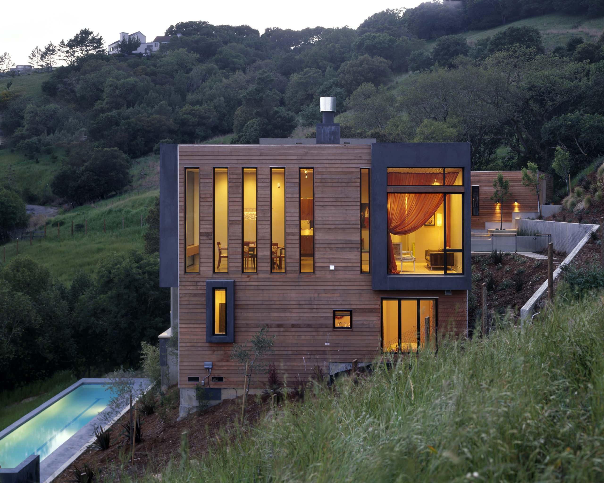 Dark materials on the exterior, especially like this wood, further help a home blend with its surroundings. The landscaping wood chips create a soft buffer between the house and natural grasses, while concrete retaining walls peel from the house and hold the back the hillside.