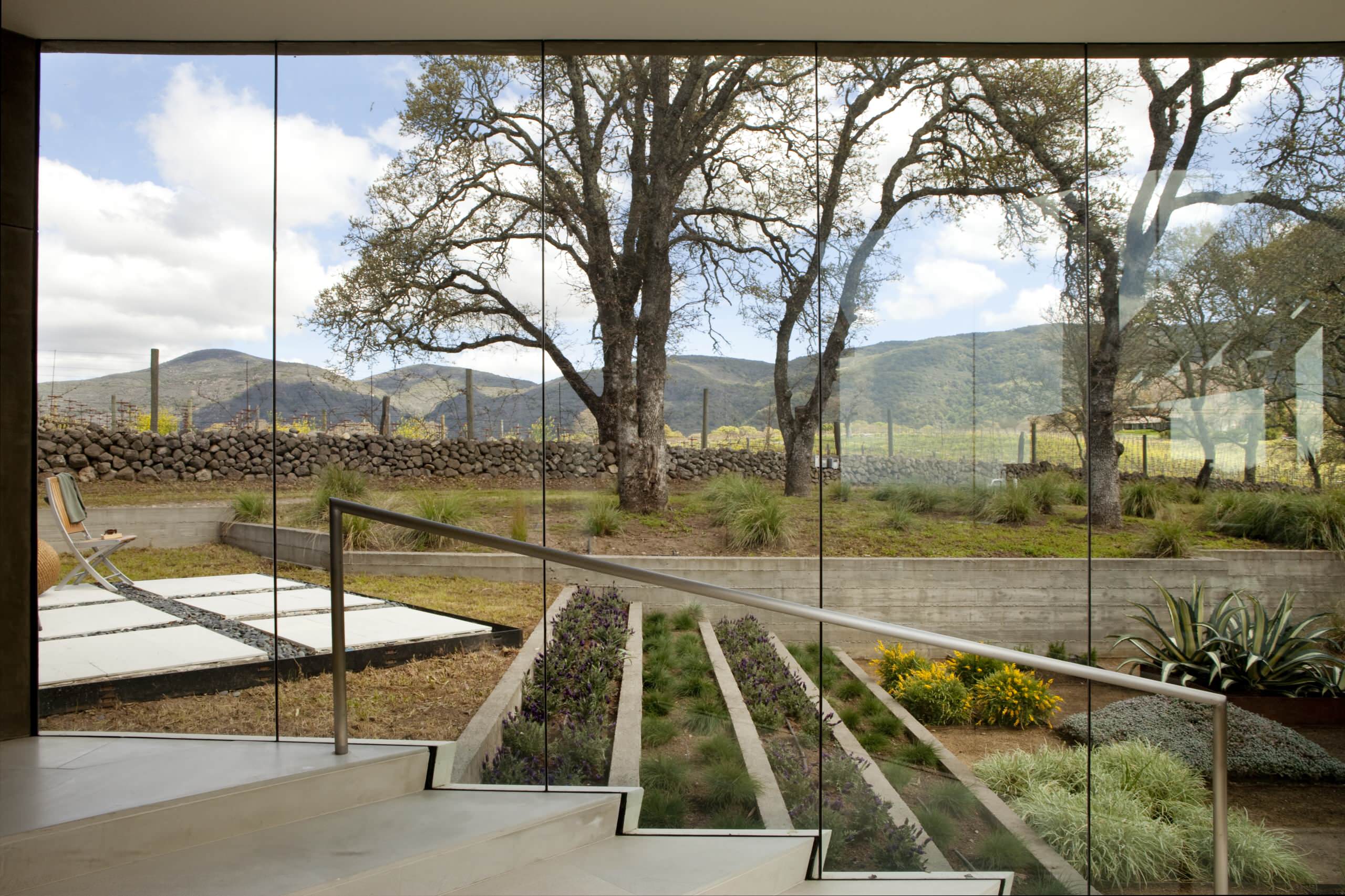 Terraced strips of vegetation on the exterior match the pattern of steps on the interior of this home. With translucent glass, this relationship between the exterior and interior is beautifully apparent and understandable.