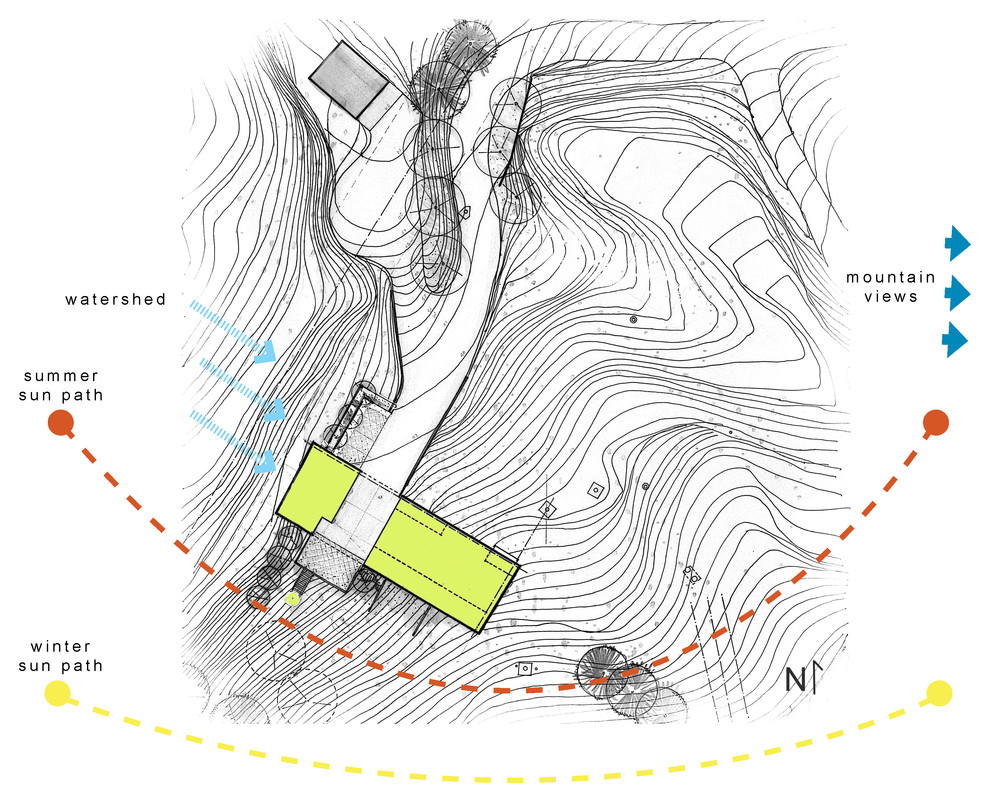 The sketch here shows a balance in minimizing earth excavation, allowing natural water flow around the building, maintaining great southern exposure and providing views to the mountains beyond. Whew! That’s a lot, right? Your architect is there to help.