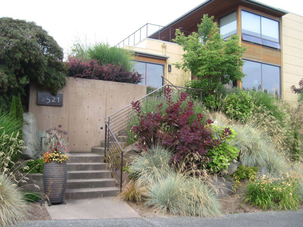 Along the front walkway of this home on Bainbridge Island, Washington, ‘Evergold’ sedge (Carex oshimensis ‘Evergold’) contrasts with magenta-colored ‘Brass Lantern’ heucherella (x Heucherella ‘Brass Lantern’) and black mondo grass (Ophiopogon planiscapus ‘Nigrescens’).