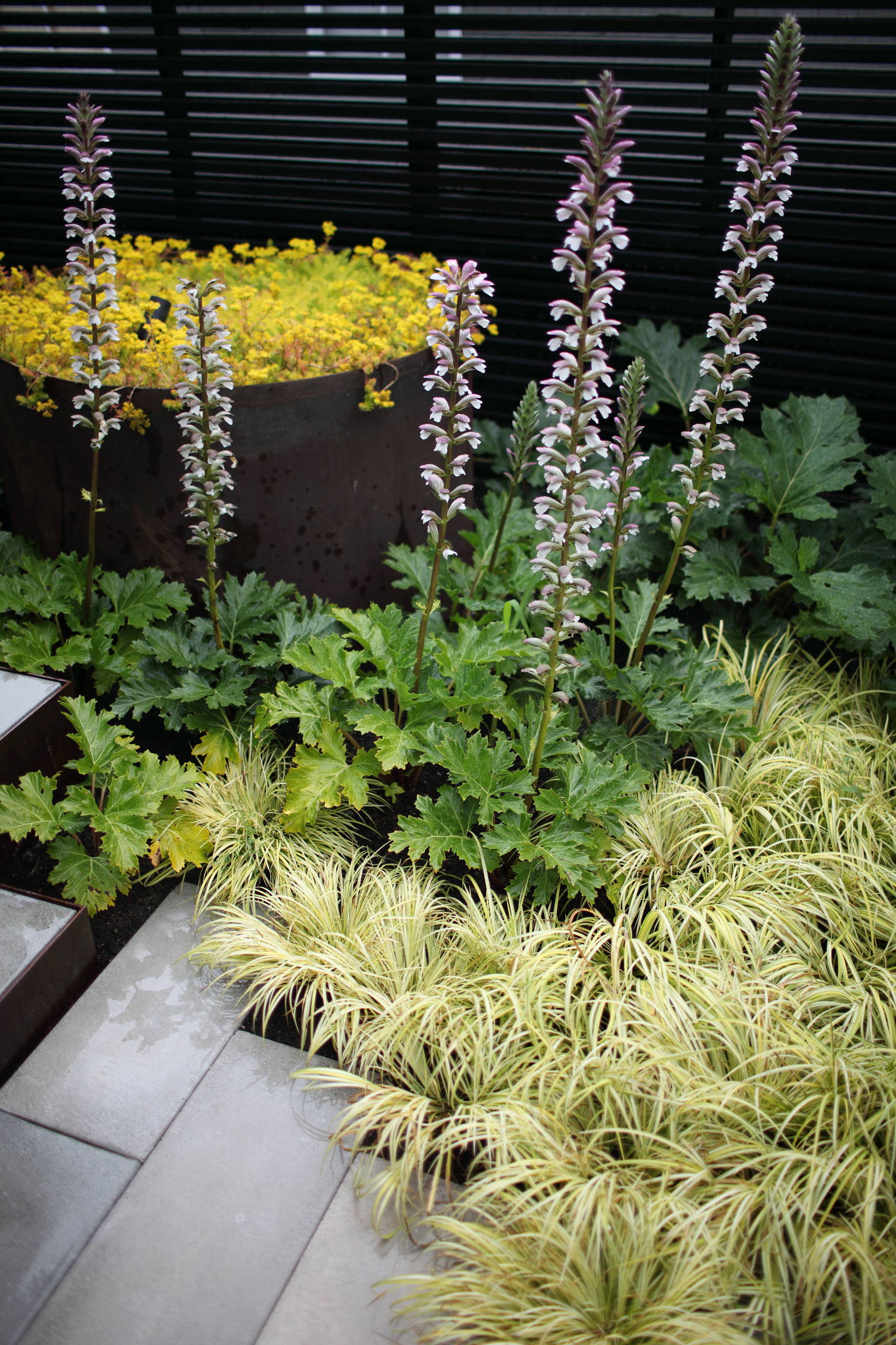 Form. Consider both the shape of the plant and the size and shape of its leaves. Beds made up of similarly sized plants with the same leaf shape can be fairly dull. For the most drama, mix plants with big, bold leaves with smaller-leaved perennials and ornamental grasses. In shade, look for plants with large palmate leaves, such as bear’s breech (Acanthus mollis), shown in this Seattle area garden with strappy, grasslike sweetflag (Acorus sp.).