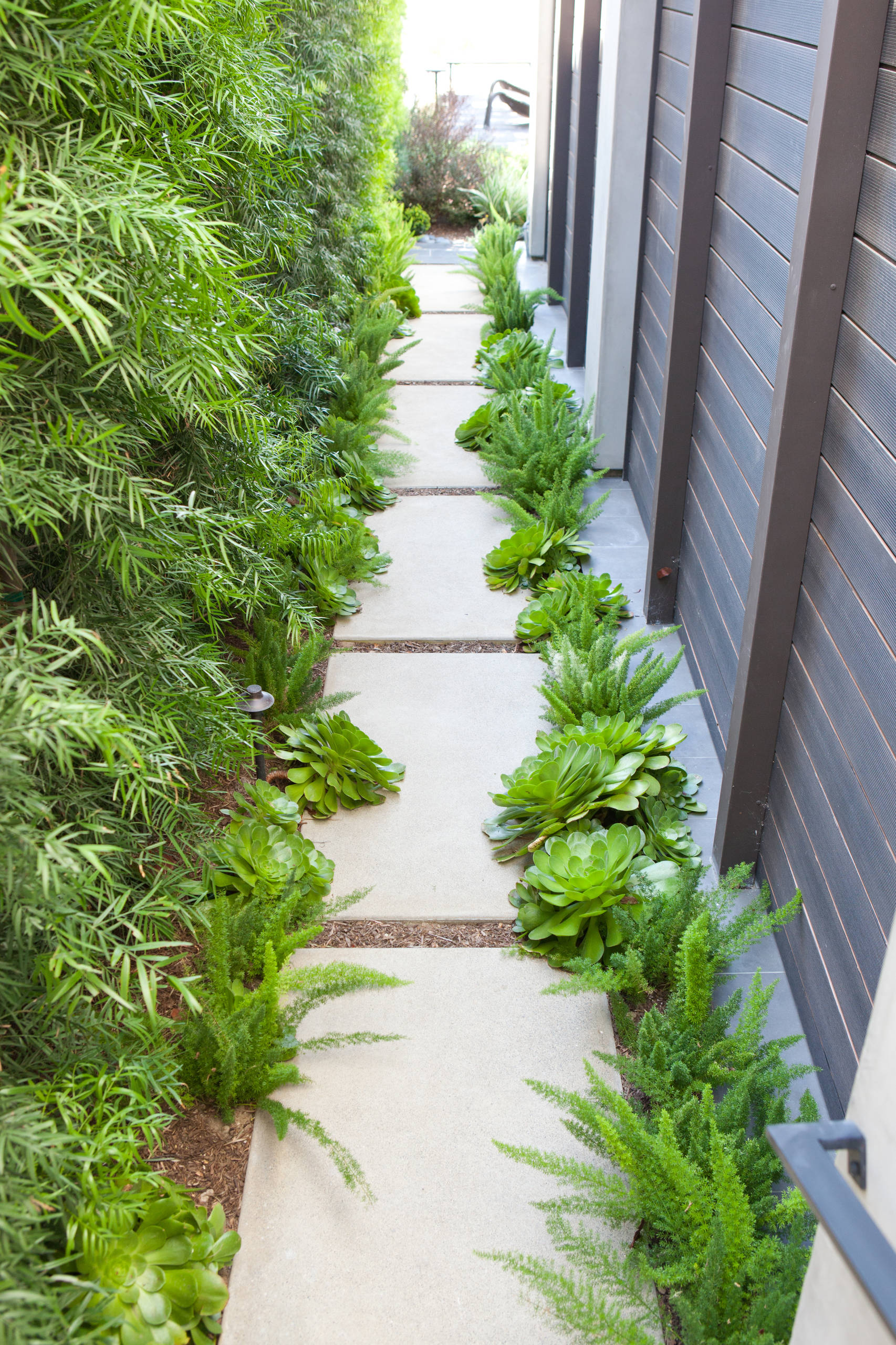 With all plants in the same shade of emerald green, this narrow side yard could potentially be monotonous. But mixing up the plant form and texture creates a stylish and visually engaging design. Succulent glossy rosettes of aeonium (Aeonium sp.) contrast with plumelike foxtail ferns (Asparagus densiflorus ‘Myers’) and the thin needles of fern pine (Podocarpus gracilior) hedging.