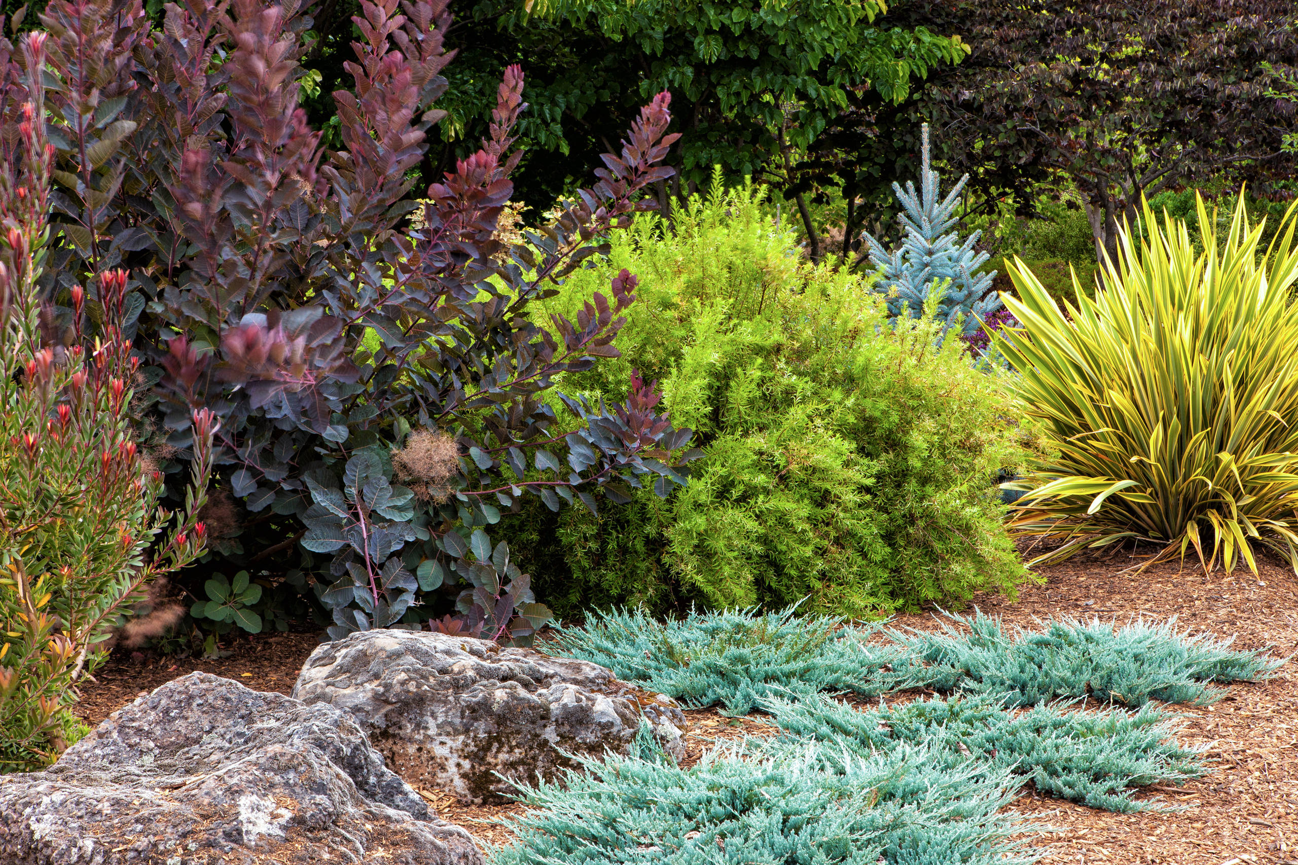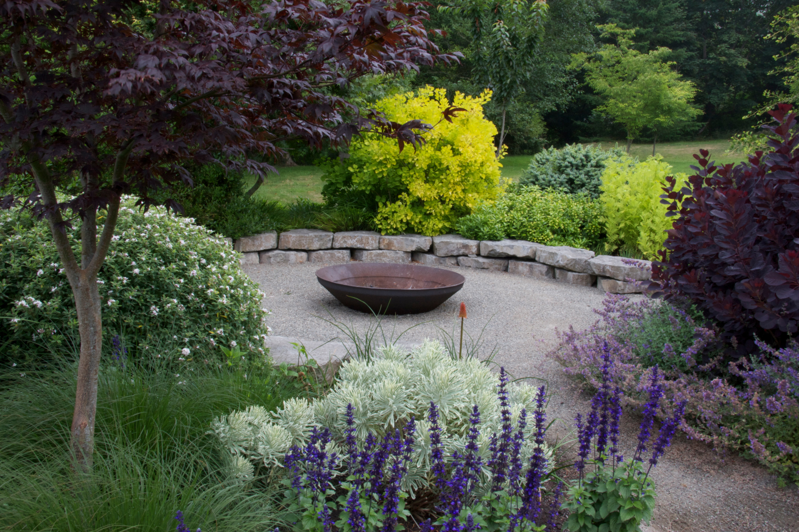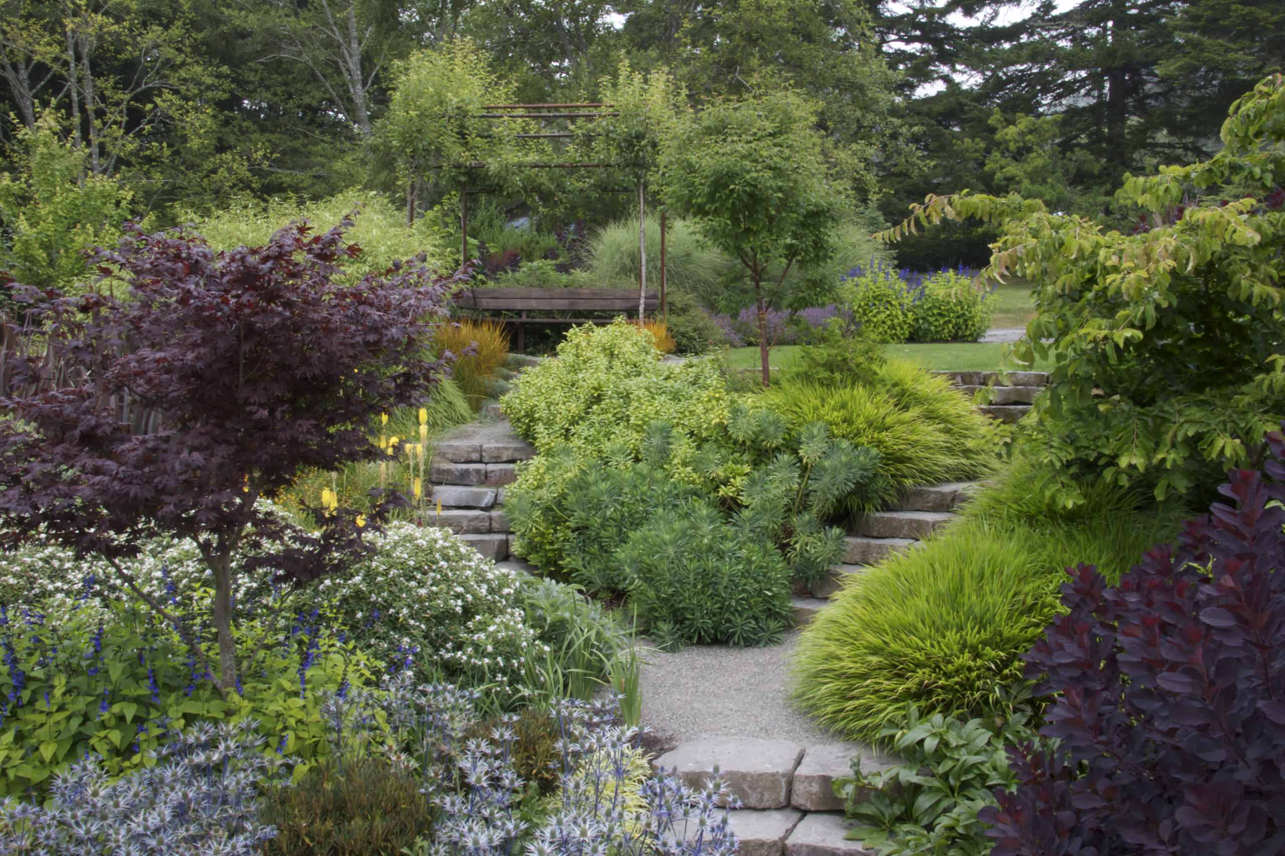 Here, a golden smoke bush (Cotinus coggygria cv.) nearly glows behind a low stone wall, complemented by its deep purple cousin. A Japanese maple (Acer palmatum) balances the plum-colored foliage to the left of the patio. In the foreground, variegated ‘Silver Swan’ euphorbia (Euphorbia characias ‘Silver Swan’) forms a mound of silvery foliage among flower spikes of purple salvia.
