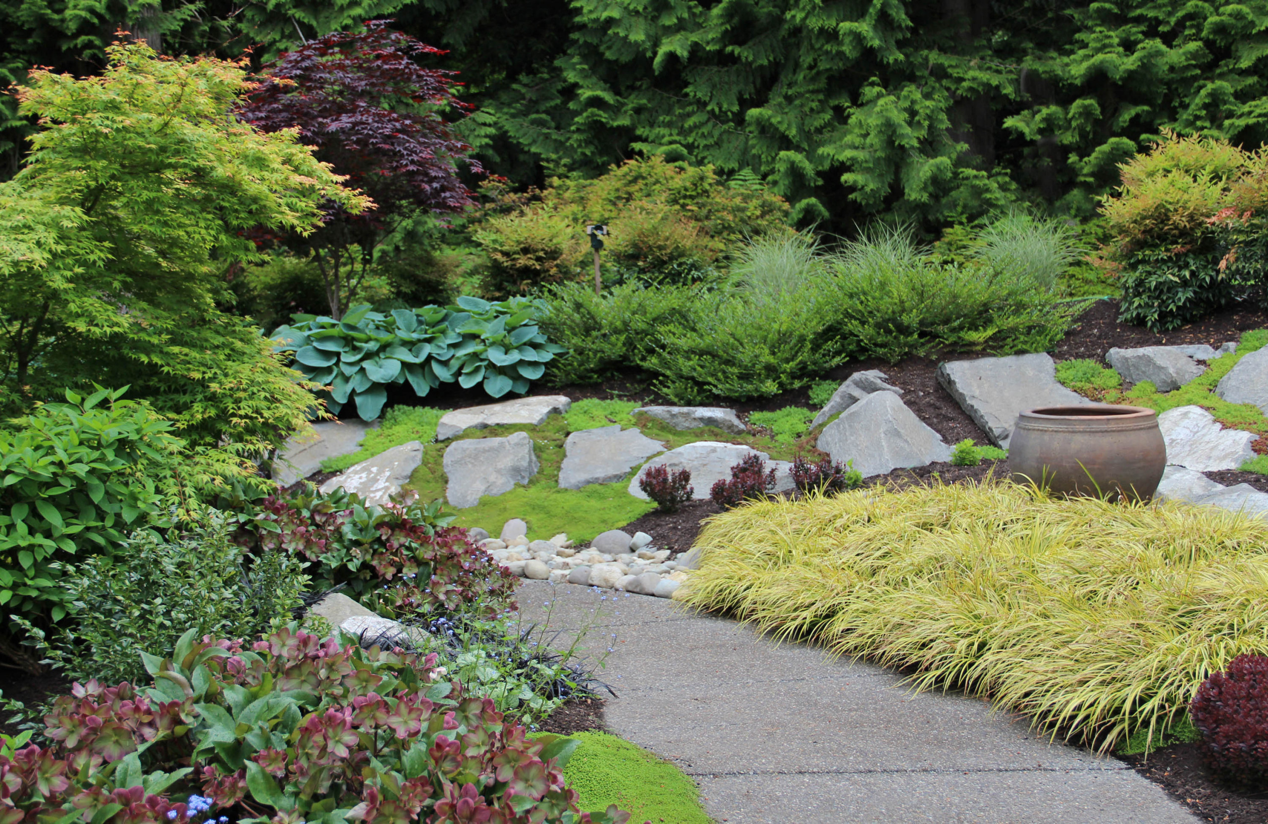Along this dry streambed, bold-leaved hostas contrast with delicate conifer needles, ruffled purple coral bells (Heuchera sp.) and fine-textured bright green ‘Angelina’ stonecrop (Sedum rupestre ‘Angelina’). As the plants fill in and grow to maturity, the contrast among the coarse and fine textures will become more dramatic.