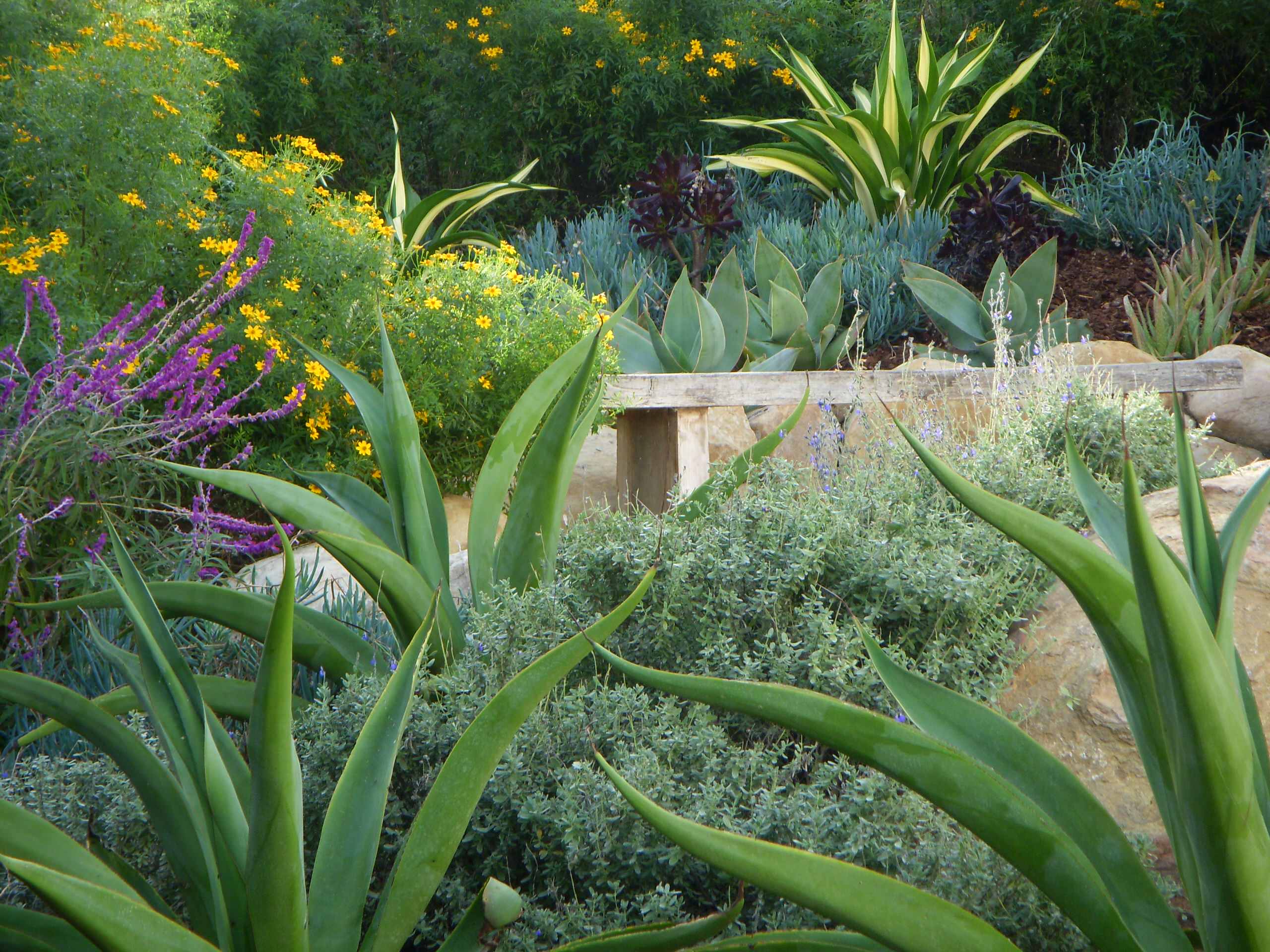 Here, bold octopus agave (Agave vilmoriniana) and fine-leaved ground covers create an eye-catching, drought-tolerant garden.