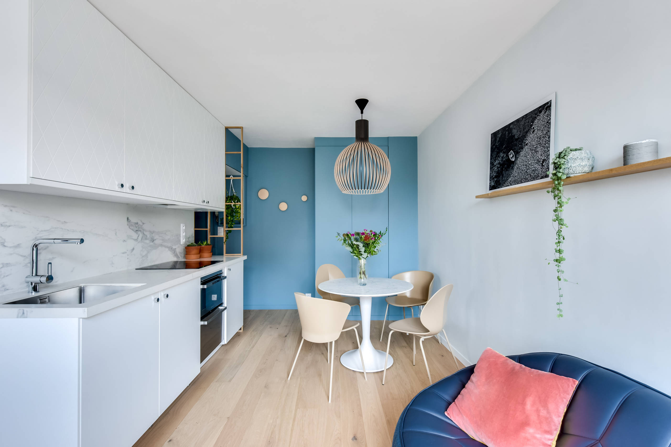 Keep in mind that a light fixture isn’t as easy to switch out as an accent paint color on the walls, so choosing a safe-bet hue like a dreamy blue is a good long-term choice.