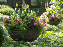 Urn-shaped. Classical-style urns (wide at the bottom with a tight neck and wider opening) are good vessels for annuals and easily removed perennials. Keep in mind that if you plant anything that is deep-rooting, once a root ball forms below the neck of the urn, it can be tough to remove the plant.