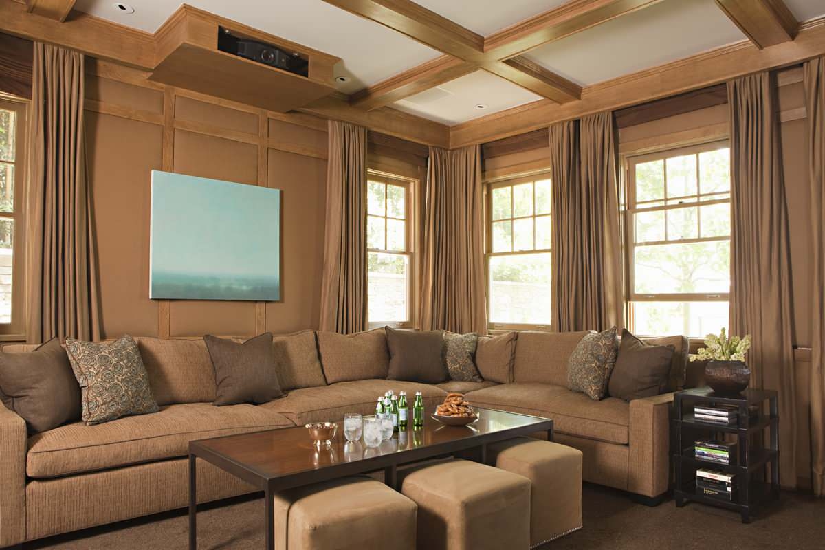 Layered treatments. Blackout curtains or shades are often necessary in a TV or media room. This media room goes the extra mile in achieving total movie theater darkness by layering a Roman shade and floor-to-ceiling draperies.