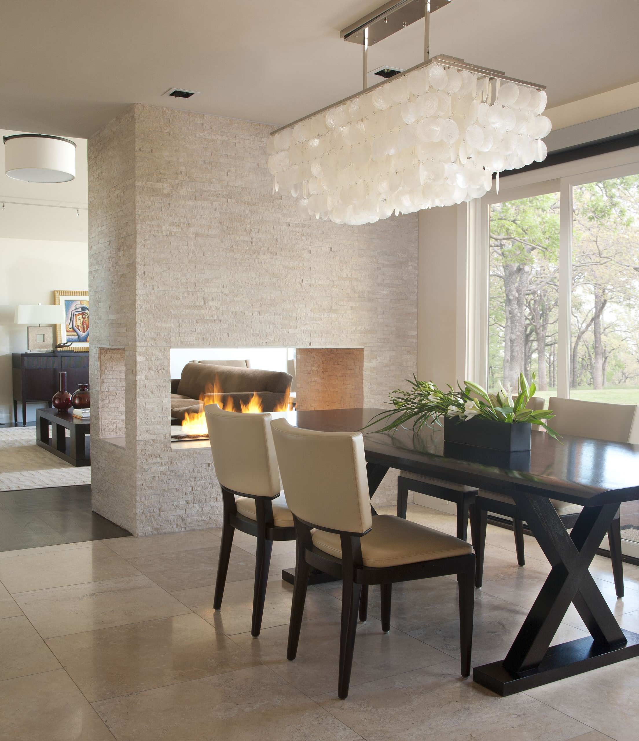 A strong, centered and weighted composition works well on small screens. In this photo, we see the detail of the table legs and the fullness of the chandelier without too much extra ceiling area. The invitation to the room beyond is a bonus that informs the viewer about how the fireplace floats within two rooms.