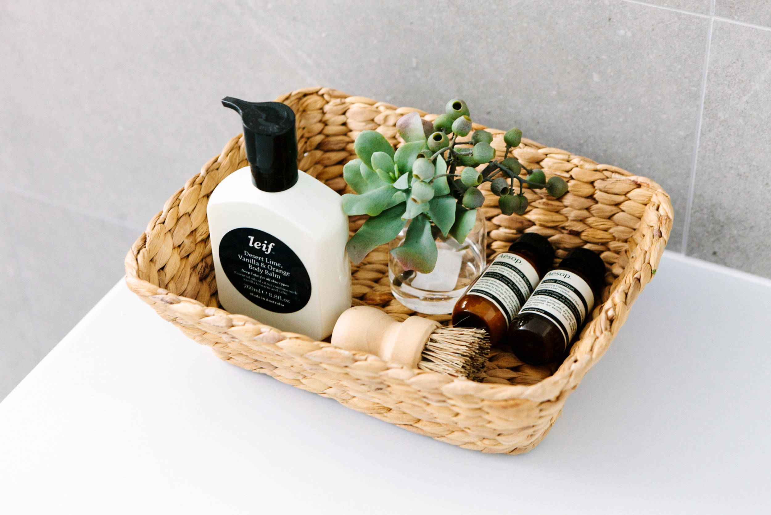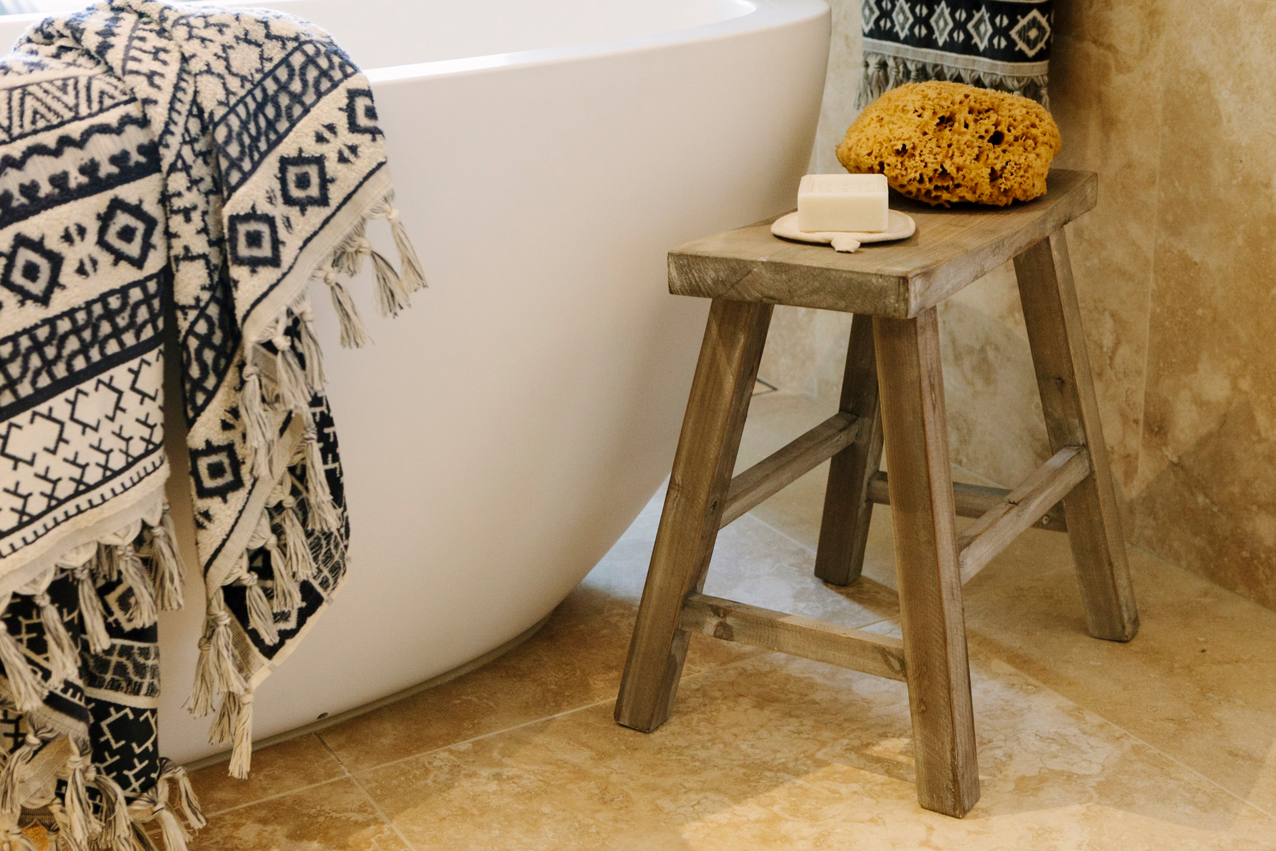 Once your space is clutter-free, you can begin to think about whether what you have in the space is really doing its job well. For instance, if you want to take relaxing baths more often, perhaps a small stool to hold your book or cup of tea beside the tub would help. Or if your sink-side essentials still feel disorganized, maybe bringing in a small basket or tray to corral them would make things feel neater.