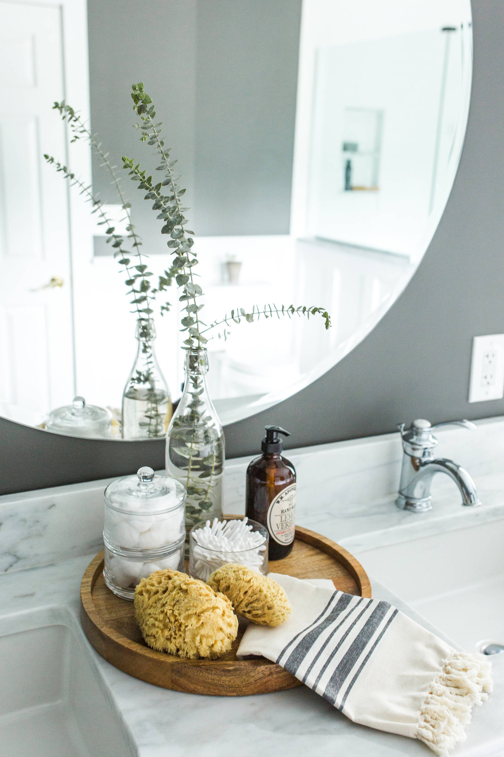 Use your newly refreshed space as a reminder to slow down and be mindful. When you wash your hands at your fresh, clean sink, keep your mind focused on the warm water and the scent of the soap instead of thinking about all the things on your to-do list. Instead of hurrying through your morning routine, take an extra moment to carefully put your things back where they belong, and enjoy the small satisfaction that comes from leaving a space better than you found it.