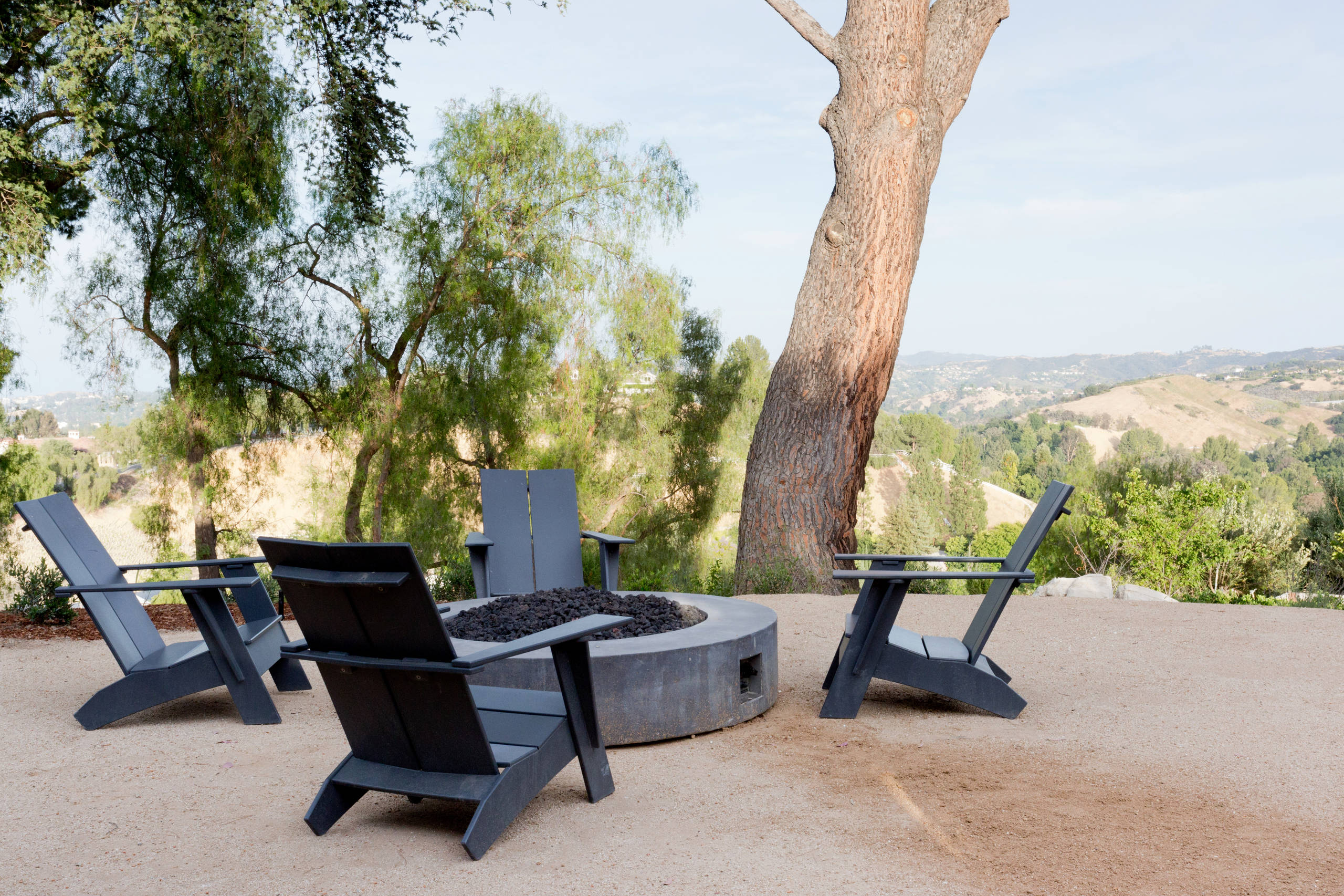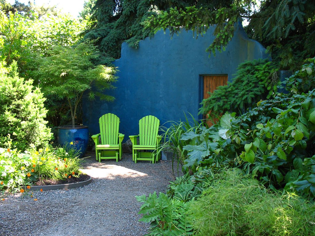To change the feeling of a space without adding back any clutter, try rearranging outdoor furniture for a new perspective or adding a fresh coat of paint in a surprising hue. This pair of lime green Adirondack chairs set against a cobalt blue wall brings energy and life to the otherwise fairly monochromatic garden.
