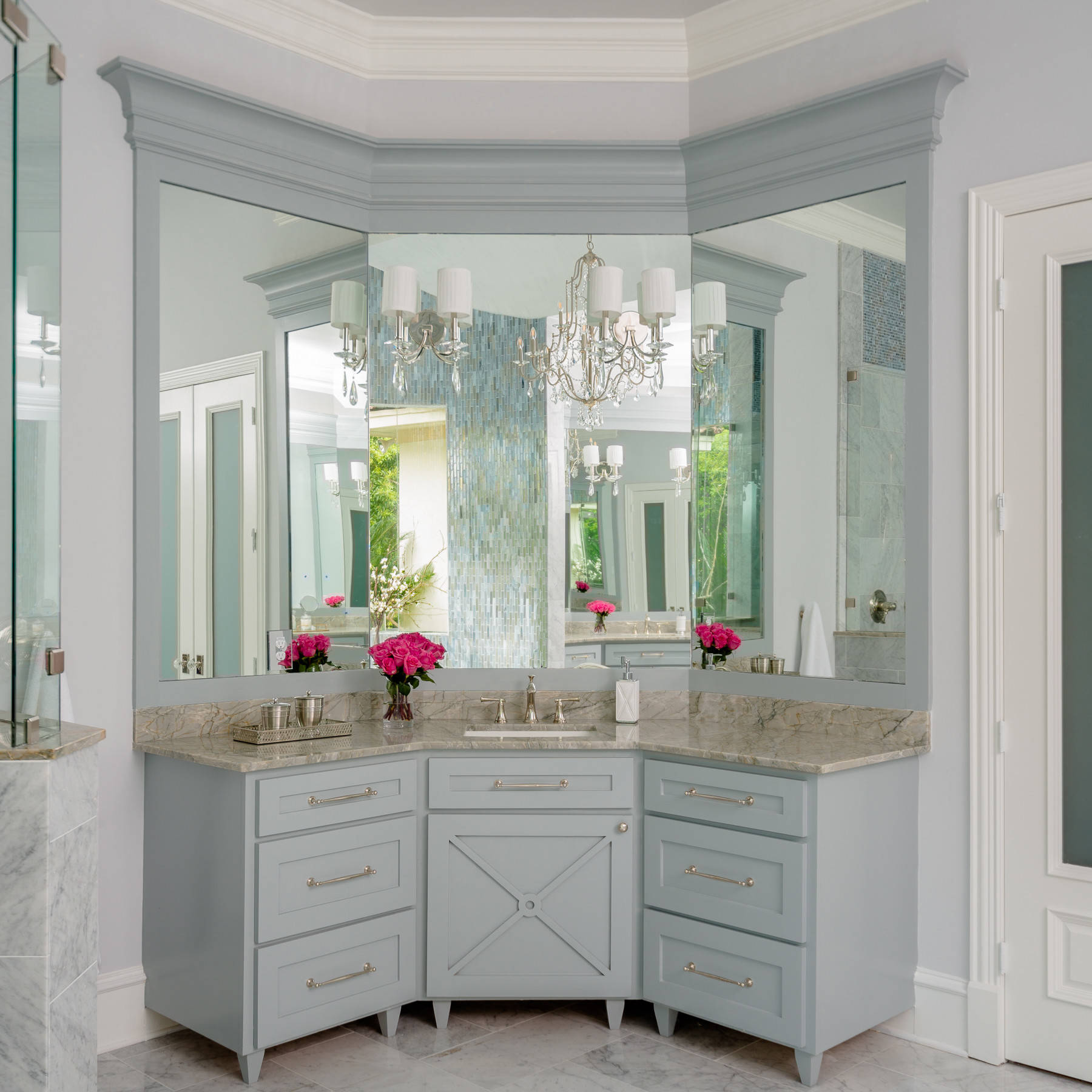 The vanity and mirror unit here takes over the awkward corner space in this bathroom, to make an unusual and stylish spot.