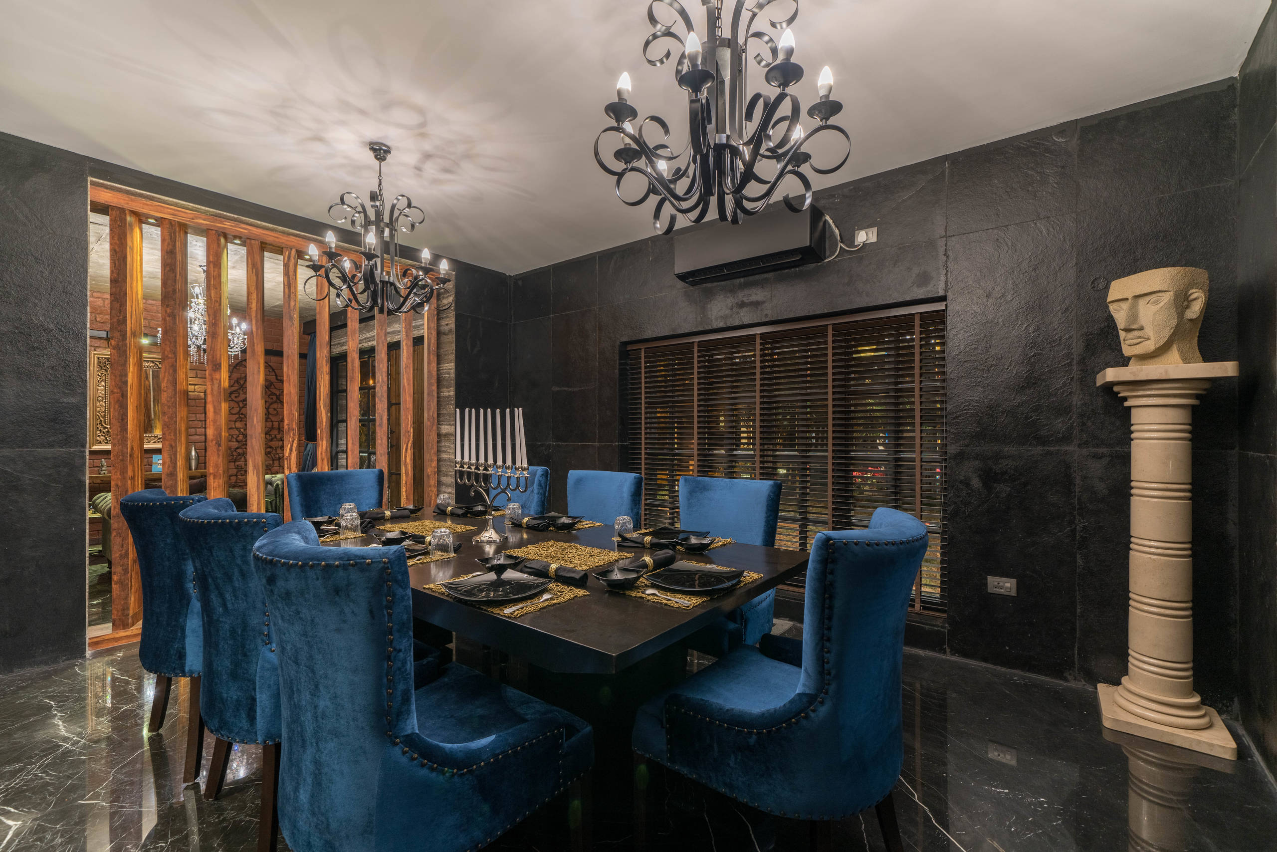 Filling up the space in the corner of the room is a tall sculpture – its pale earthy make stands out against the dark polished walls.