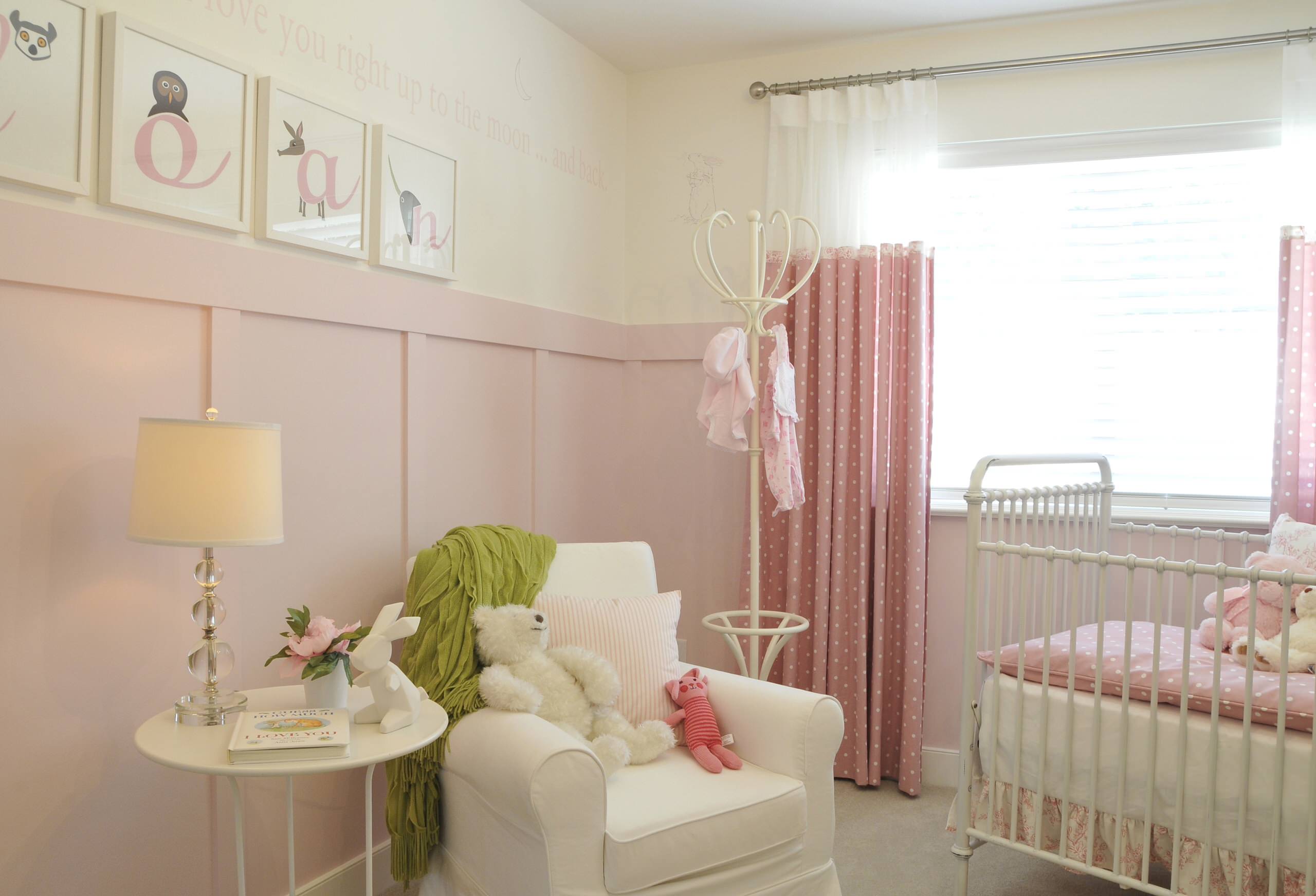 In this nursery room, a stylish tall corner clothes stand is a useful place to hang the toddler’s clothes – its colour complements the palette of the room, too.
