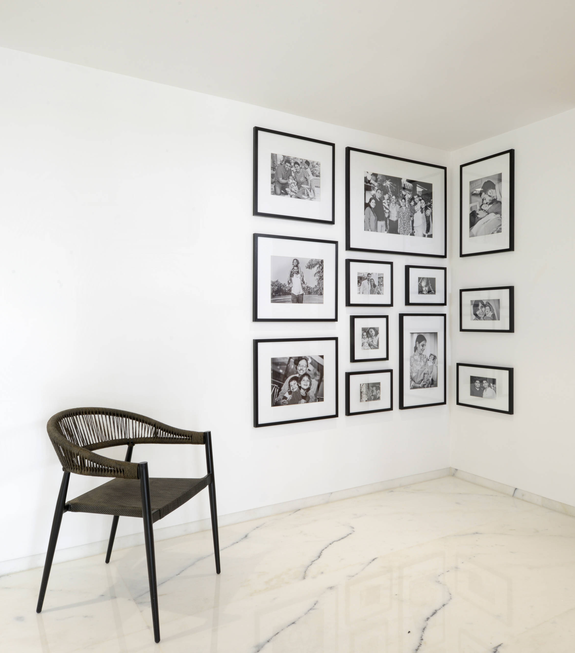 An art corner idea – the dead space here is utilised as a canvas for images. The black-and-white framed pictures give the area an art-gallery-like feel.
