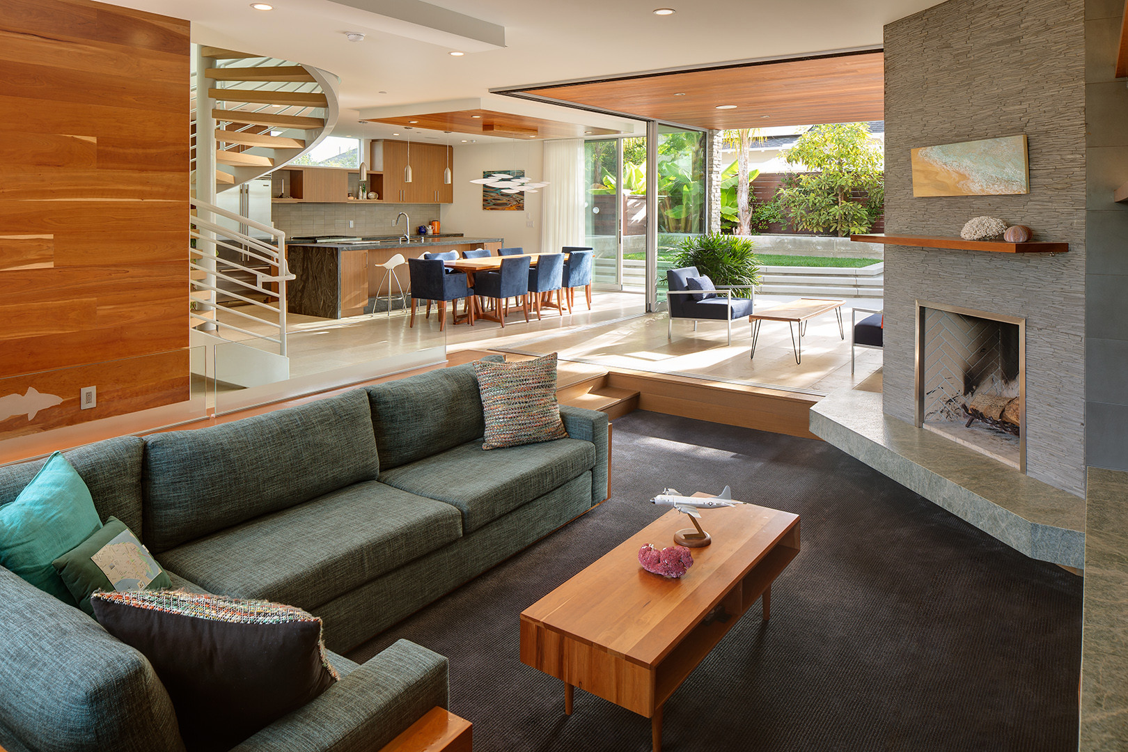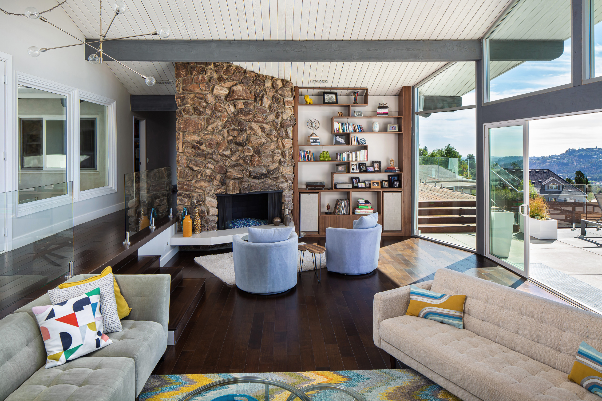 In a funky midcentury modern home remodeled by Metropolis Drafting and Construction, this sunken room has a pathway from the steps out to the sliding doors that essentially divides it into two, with seating areas on both sides.