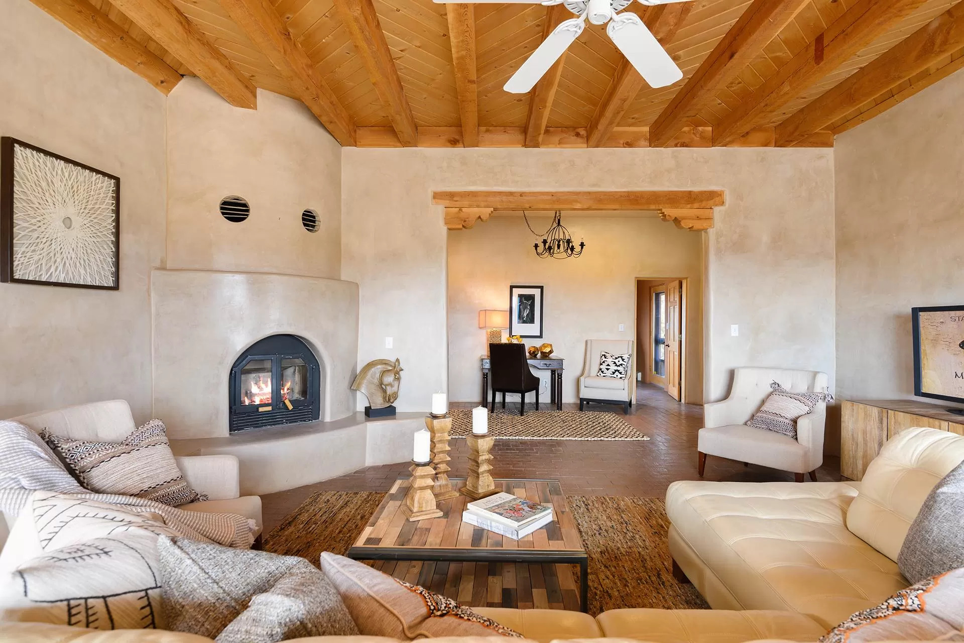 On another wall. Doorways, windows and other architectural elements also can leave few places for the television. But wherever the TV ends up, the seating arrangement ideally will allow for comfortable viewing of both it and the fireplace, as is the case in this Southwestern-style living room by Metamorphosis.