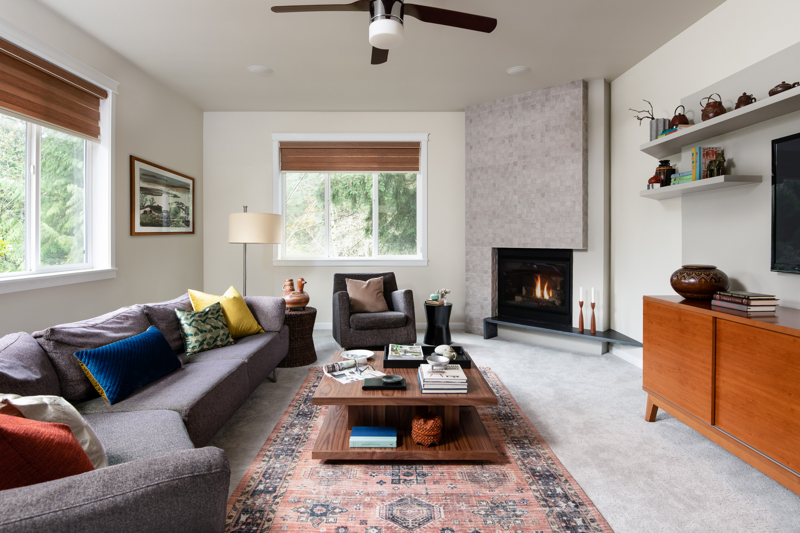 If you’re lucky enough to have a fireplace in the corner of your living room or family room, you know that it can be both cozy and confounding. You might wonder how you should orient your couch and rug. And where should the TV go? Doorways, tight square footage and other variables can make those decisions even harder.