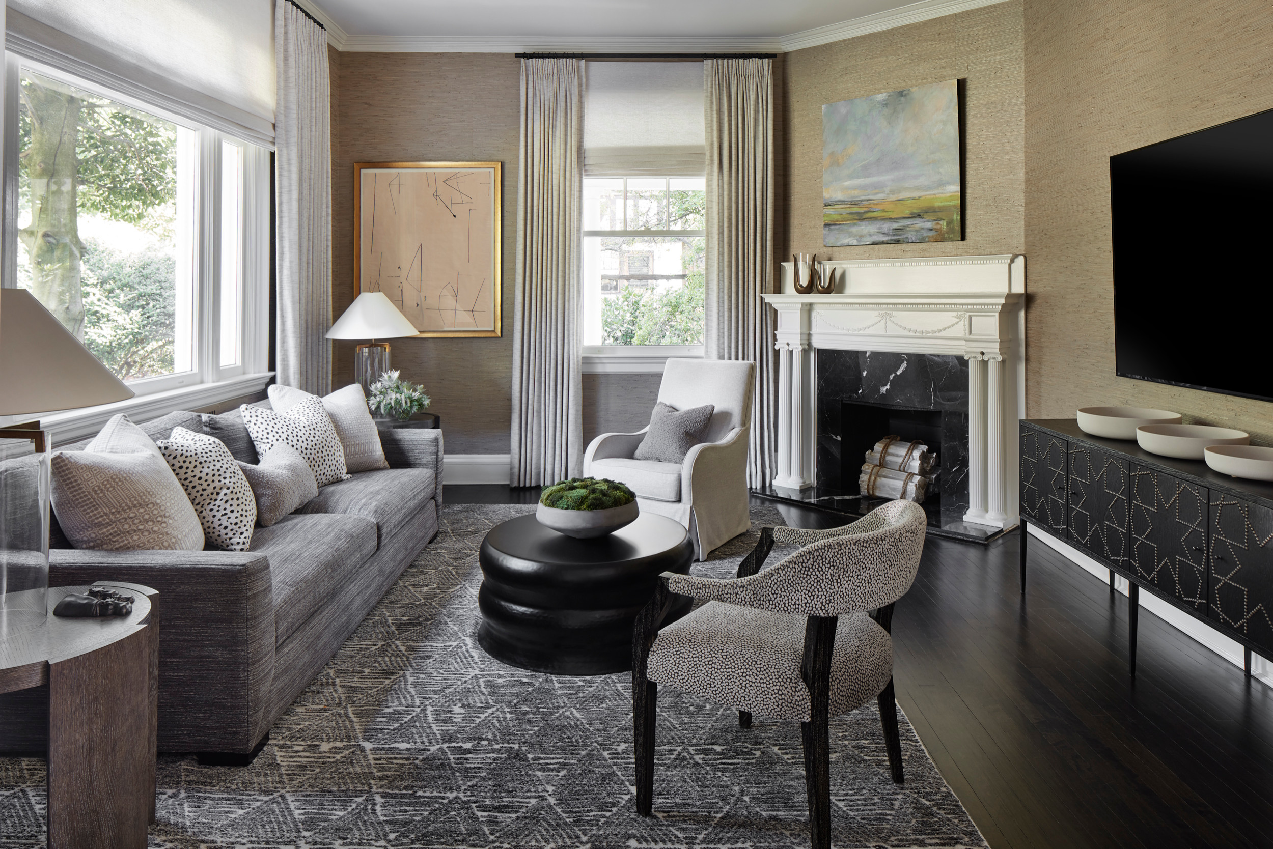 This transitional living room, designed by House of Funk, has a fireplace with an ornate mantel and a complementary television-and-studded-console combo. Because the fireplace and the entertainment center are on adjacent walls, those seated on the couch can enjoy both. Two additional chairs opposite the couch have been placed so they don’t block the view but do allow for conversation.