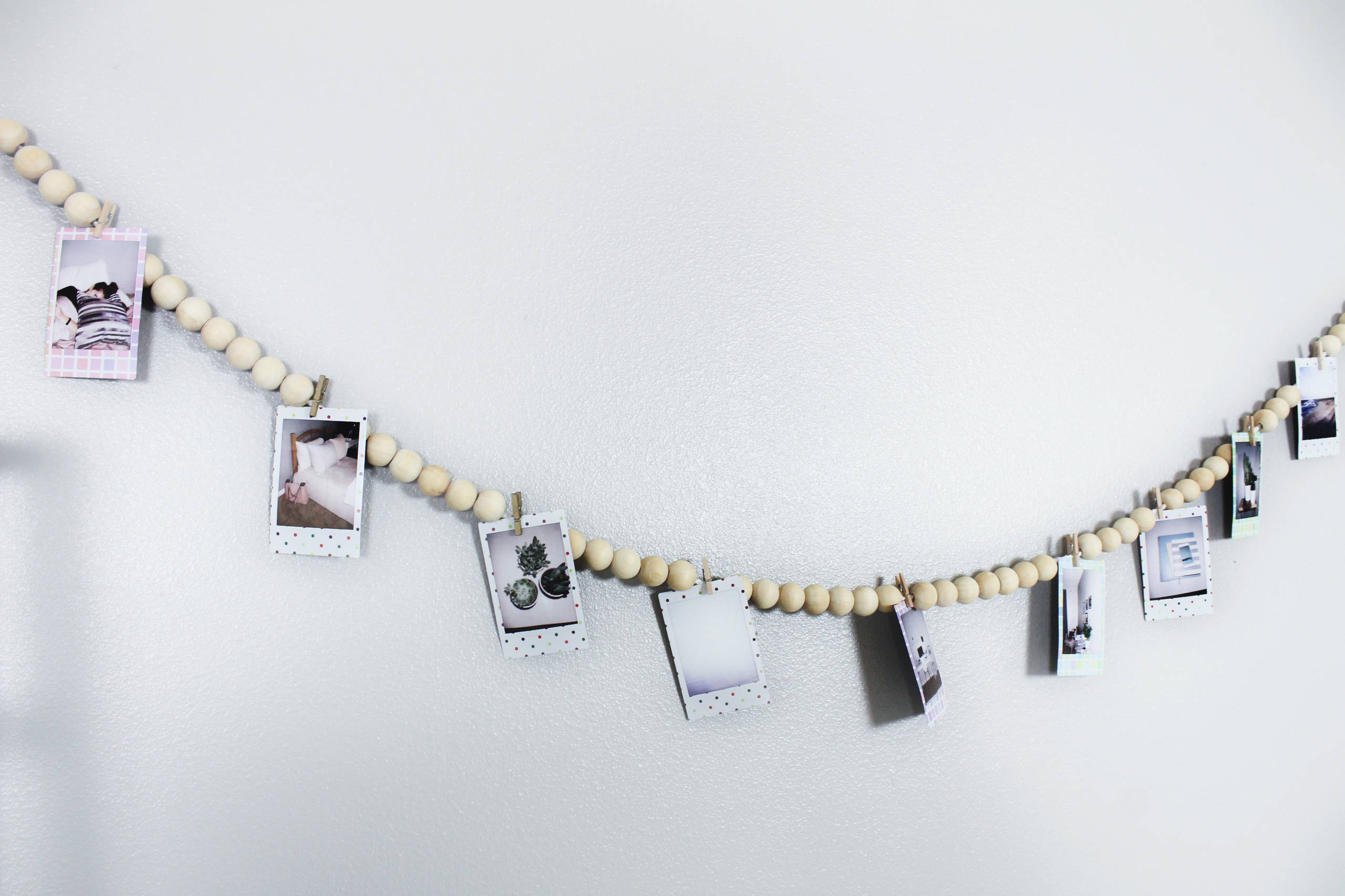 It’s also one of the more affordable ideas on this list. All you need is a clothesline, some clothespins and your printed photos. Attach each end of the line to a wall and clip your keepsakes to it.