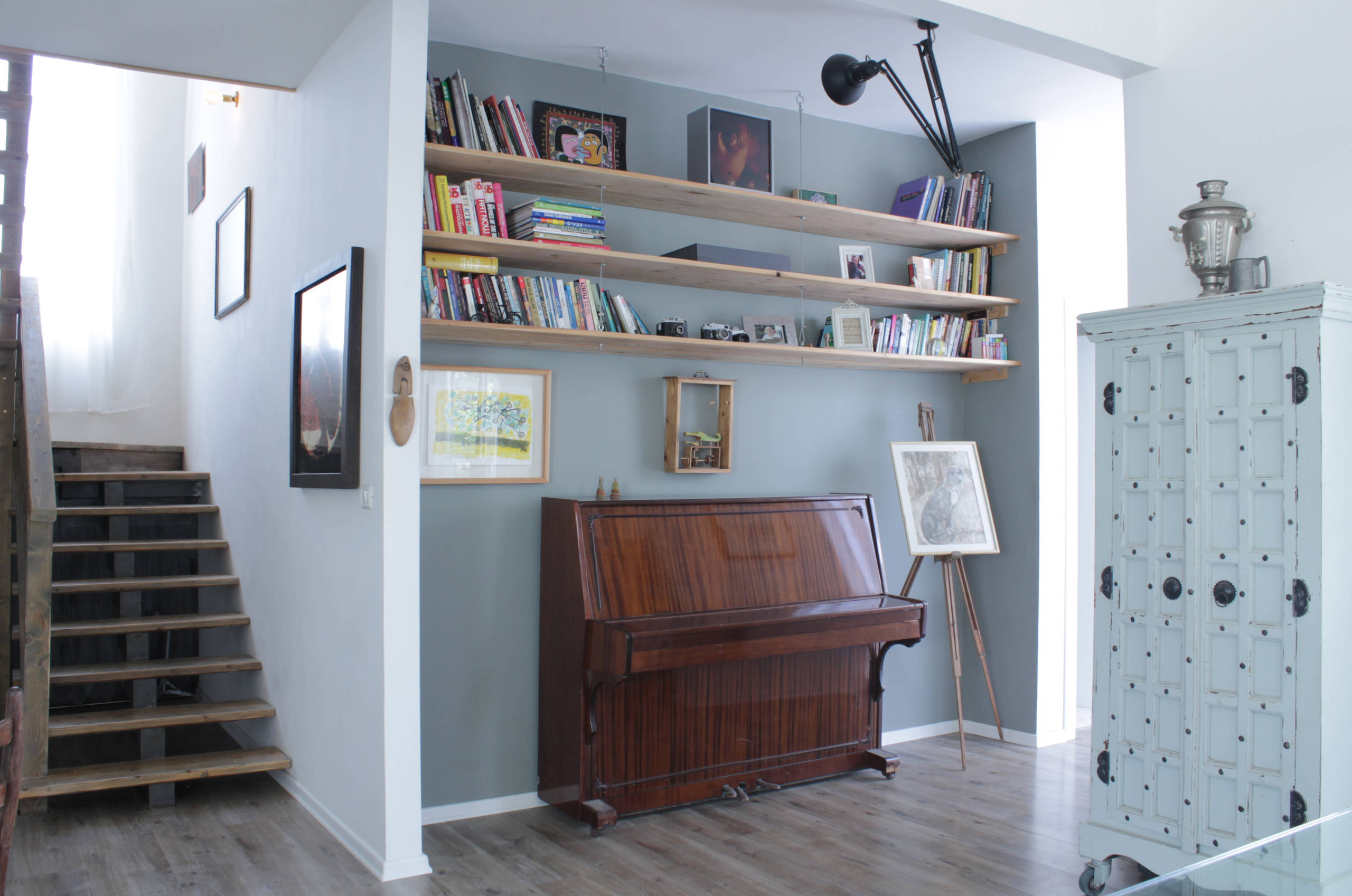 Here, an authentic boat ladder installed on the wall plays up the room’s aquatic theme. The homeowner used its rungs for photos, books and decor.