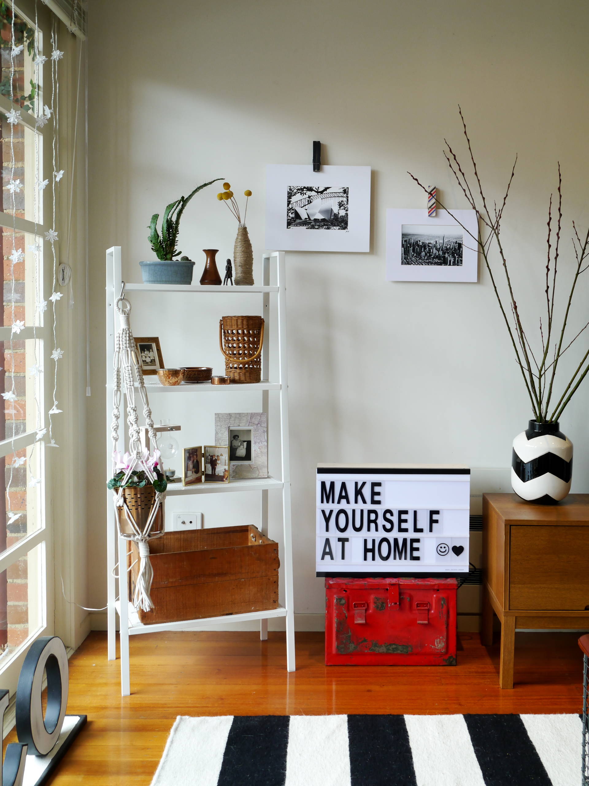 Here, a freestanding ladder adds display space without any nails. The rungs are wide enough to mix in baskets and plants.