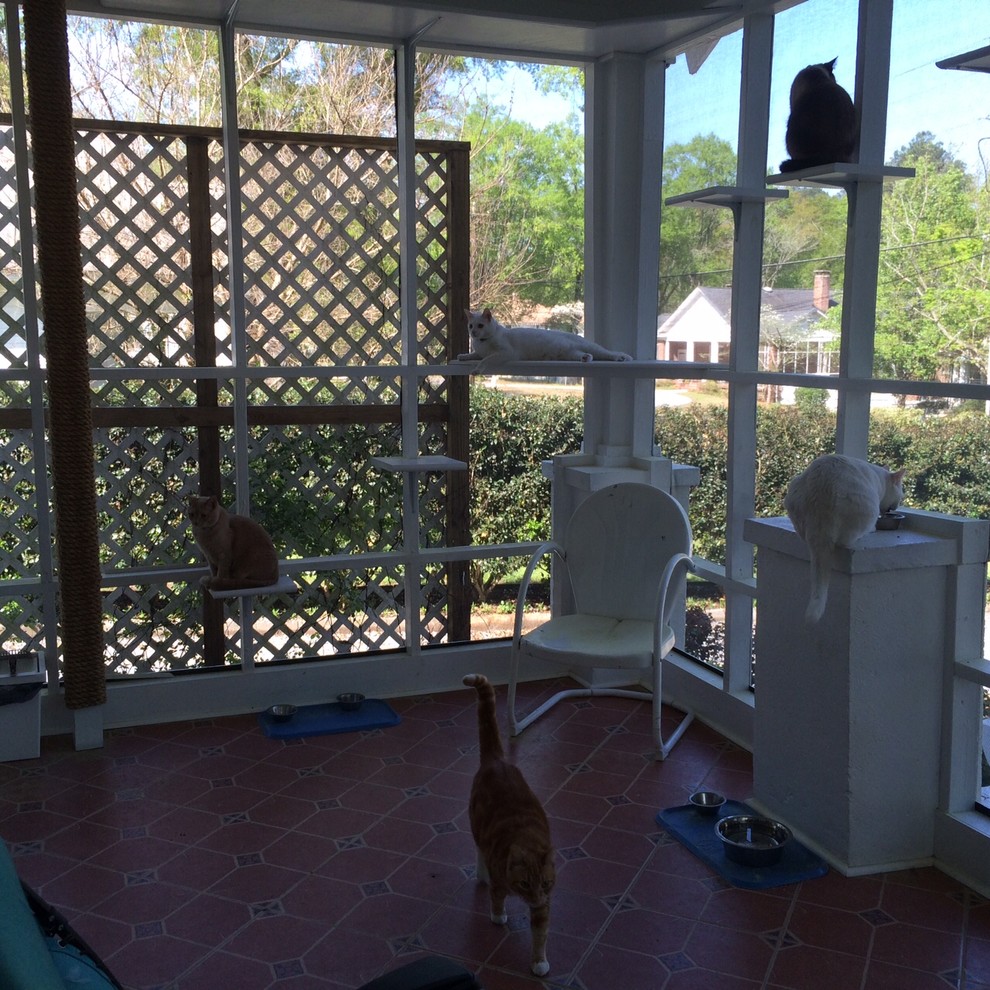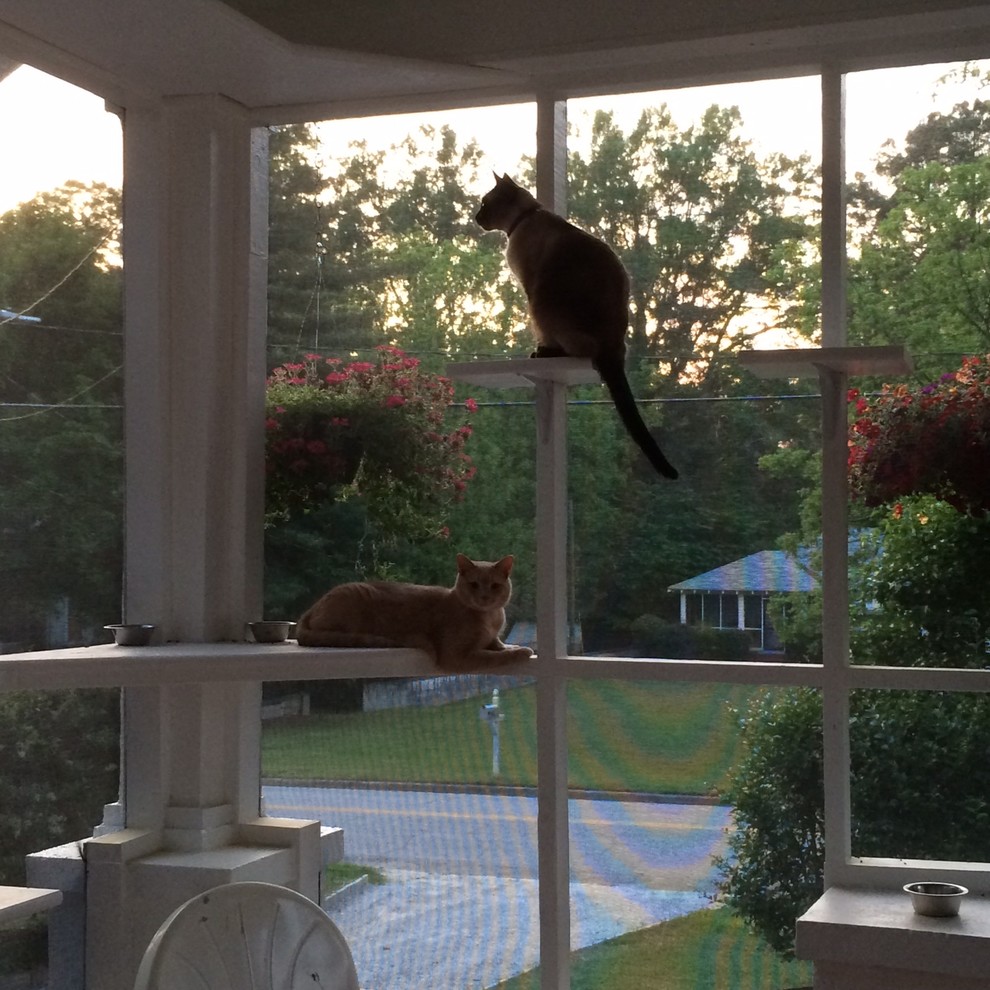 The couple screened in an existing 11-by-17-foot porch, built walkways, steps, corner platforms and a sisal rope firefighter’s pole for the cats to climb on and use as a scratching post. They tiled the screened-in porch themselves with Mexican tile and used a vintage door, which they found at the Antique Tobacco Barn in Asheville, North Carolina.