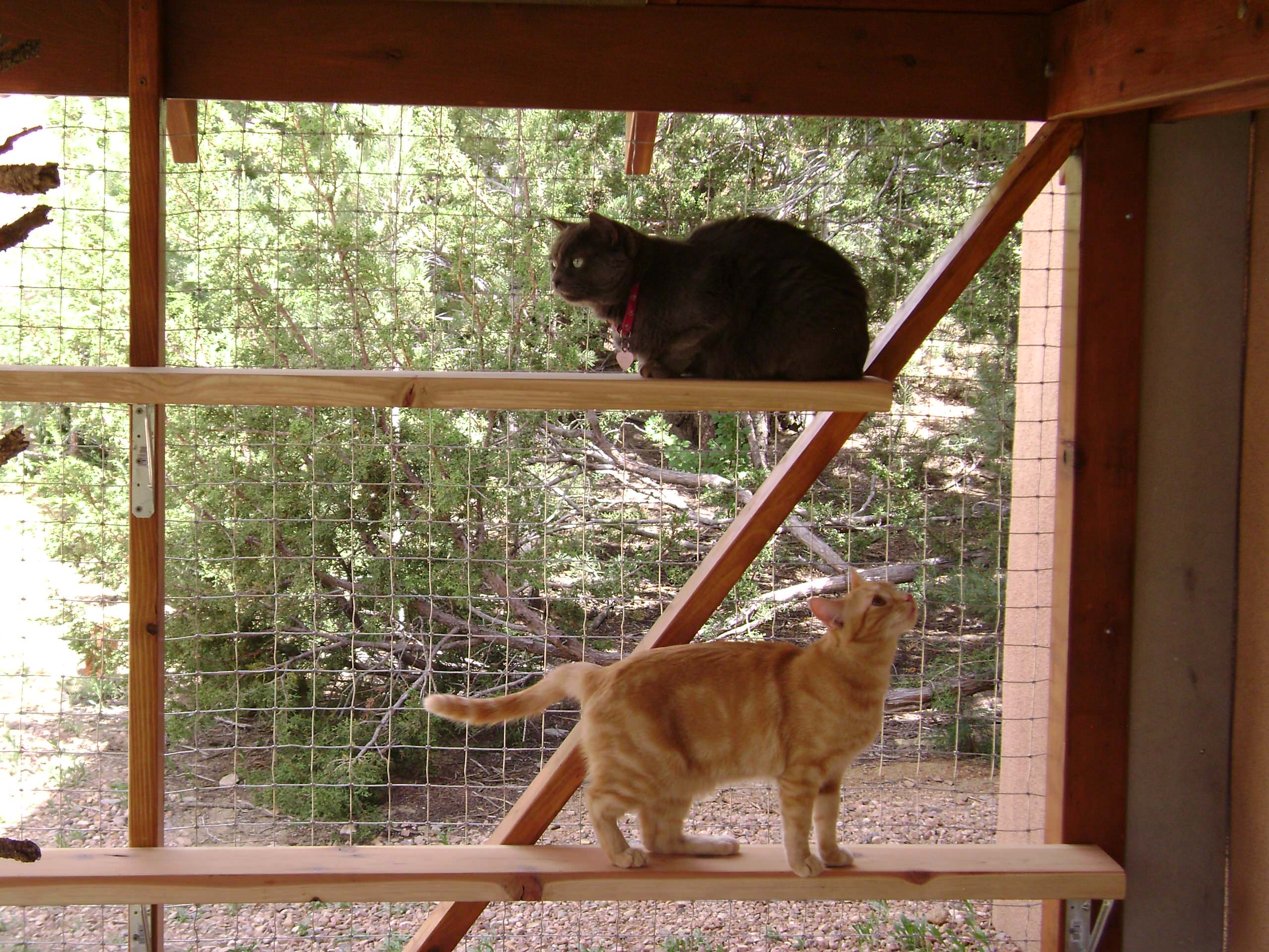 The type of wood he uses depends on aesthetics, weather at the location and termite risk, Creviston says. He uses pressure-treated lumber for the structures but not for platforms where cats sleep and roll, unless it’s coated and sealed. Rather than ramps, he prefers wood platforms for cats to jump onto. “It is a good idea to use lots of levels as cats love to be up high where they feel more secure and can survey their world.”