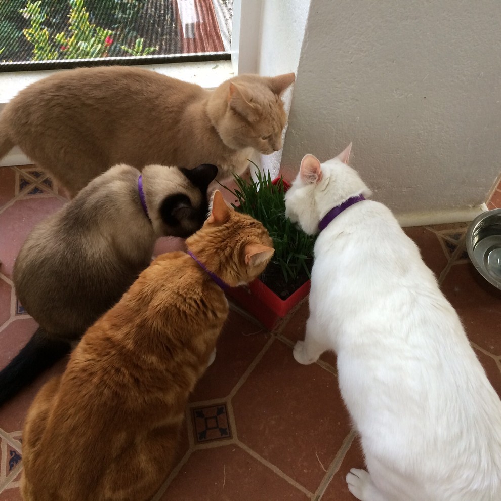 The cats are supplied with cat grass, which they graze on all day, Aimee says. The couple installed two cat doors on either side of the front door. With multiple cats, she recommends installing several access doors since cats tend to be territorial. “We didn’t want one cat to hog the porch by not letting the others out the door,” she says.