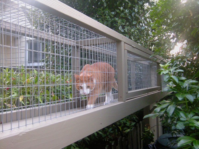 Zeigler used cedar for the wood elements and 1-inch PVC-coated galvanized hardware cloth for the screening. This type of material is typically used as fencing to keep out pests such as snakes and gophers. He said the project took about 60 to 80 worker hours. For those attempting something like this on their own, he recommends hiring someone who is handy and who knows and understands cats.