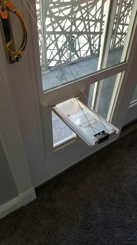 The builders modified the existing sliding glass door to accommodate a cat door. In this photo, a clip was used to keep it open until the cats got used to it, Jorgensen says. Right now, the catio interior is bare bones until the homeowners decide which features the cats prefer, she says.