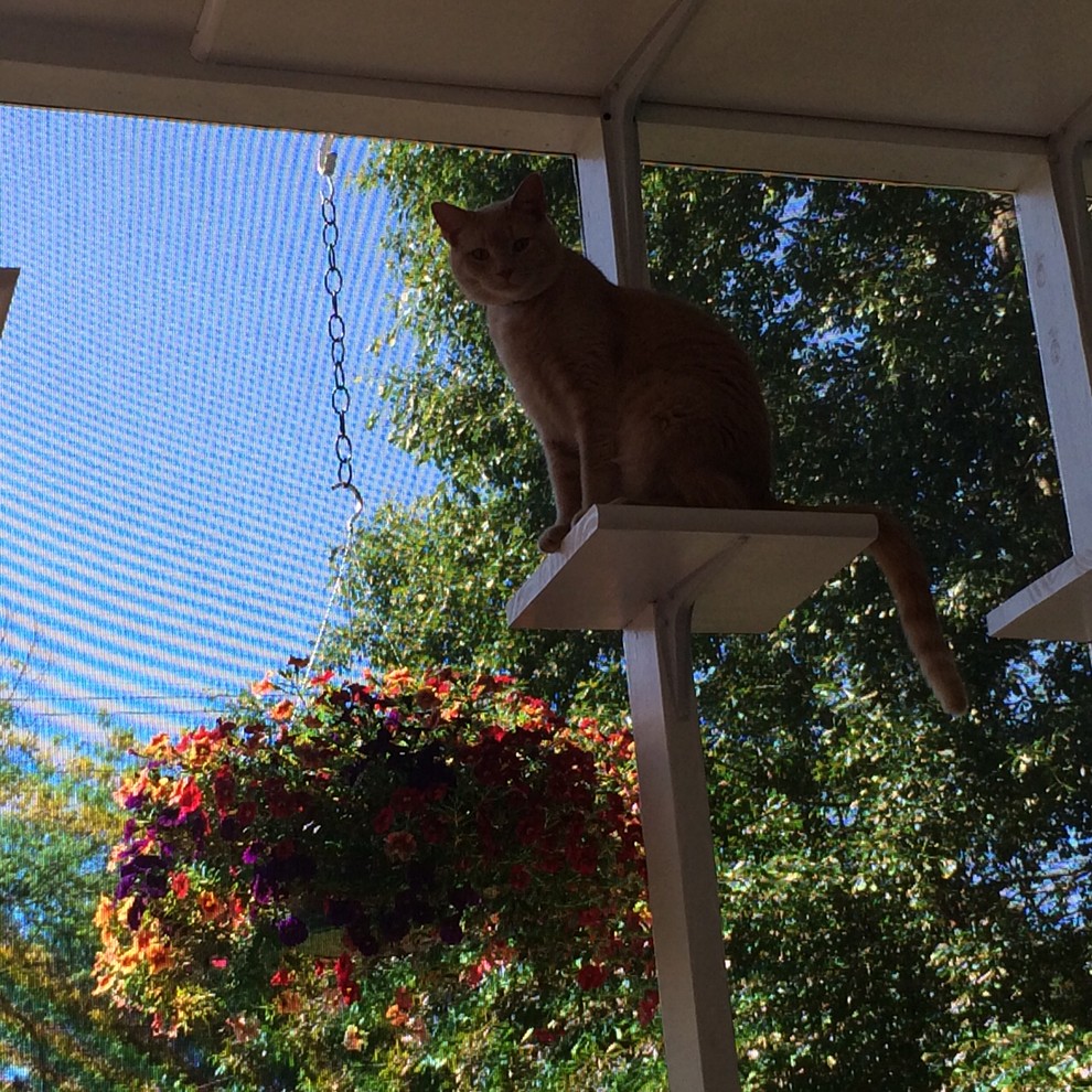 Reid added the catio to his house (which he had built five years earlier) after adopting three kittens. “They were starting to get large and extremely active,” Reid says. “We already had three older cats and felt they all needed some additional space options to keep the peace. We felt an outdoor space was what they needed. Since we live in an area that has cars, coyotes, bobcats and other hazards for cats, letting them roam freely around outside was not an option.”
