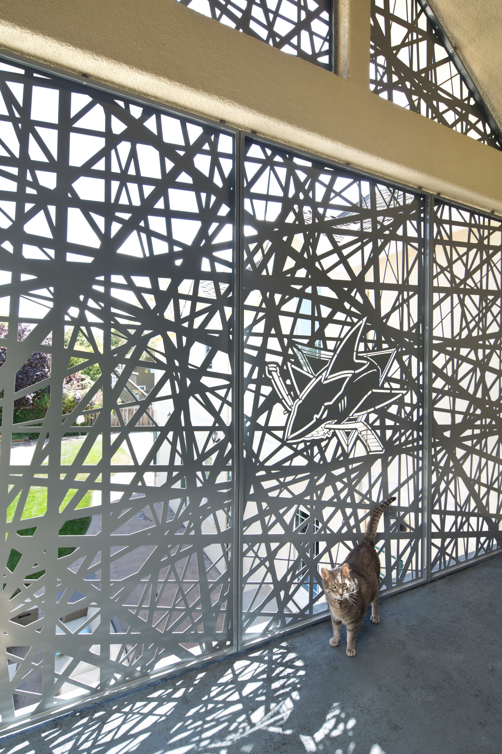 Here’s a view of the catio from the home’s exterior. It opens to a hallway that goes into the home’s media room, where the owners host parties. The screen pattern (called, cat-appropriately, Bird Nest) and shark logo cast interesting shadows throughout the hallways, Jorgensen says.