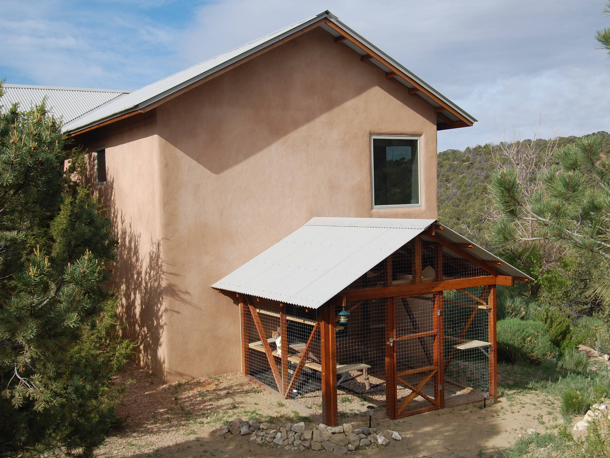 The tree is for scratching and climbing. The screening is two-by-two kennel fencing from Lowe’s. Reid used eight four-by-four cedar posts set into concrete-filled holes for the structure, with two-by-two fir beams and rafters. The roof is corrugated steel panels left over from the house construction.